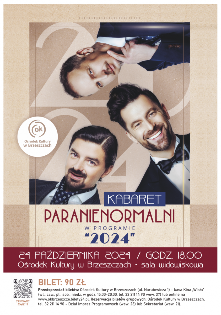Cena Biletu: 90 zł KABARET PARANIENORMALNI Kabaret Paranienormalni swój pierwszy program stworzyli w 2004 roku. Znalazły się w nim m.in. skecze: Papieros, Młotek, czy Gołębie. Początkowo w składzie znajdowali się Robert Motyka i Igor Kwiatkowski, którzy występowali na scenie oraz Rafał Kadłucki, który był odpowiedzialny za techniczną stronę kabaretów. W 2008 roku do grupy dołączył Michał Paszczyk – aktor i artysta kabaretowy związany z wrocławskim kabaretem Neo-Nówka. W roku 2017 szeregi grupy opuścił Igor Kwiatkowski, który wcielał się m.in. w postać słynnej blondynki Mariolki, będącej parodią współczesnych nastolatek. Postać absolutnie kultowa, której wiele wyrażeń trafiło do potocznego języka.*******