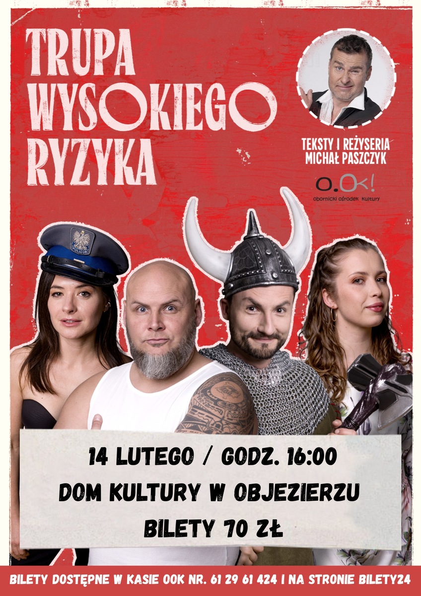 Trupa Wysokiego Ryzyka to kabaretowe zbiry, które bez litości rozśmieszają każdego, wszędzie gdzie się pojawią. Co Wikingowie mają wspólnego z Centralnym Portem Komunikacyjnym i jak oswoić Szkota dowiecie się na występach Trupy.Kto Was będzie rozśmieszał? Betona czyli Dominika Dąbrowskiego i Agatę Szafrańską doskonale znacie z serialu „Lombard.Życie pod zastaw”. Aleksandra Listwan i Maciek Kosmala to gwiazdy serialu „Dzielnica strachu” z kolei Marta Dzwonkowska, występująca wymiennie z Olą Listwan, w 2018 wygrała Festiwal Opolski. Za teksty i reżyserię odpowiada znany Wam z kabaretu Paranienormalni Michał Paszczyk. Trupa Wysokiego Ryzyka - wysokie ryzyko bólu brzucha ze śmiechu.*******