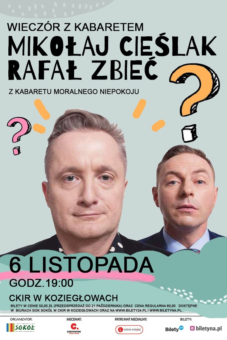 Gminny Ośrodek Kultury Sokół zaprasza 6 listopada na godzinę 19.00 do Centrum Kultury i Rekreacji w Koziegłowach na wieczór z kabaretem Mikołaj Cieślak i Rafał Zbieć z Kabaretu Moralnego Niepokoju. Wystąpią oni z wyborem skeczów, stworzonych dla Kabaretu Moralnego Niepokoju i zaadaptowanych specjalnie dla tego żywiołowego duetu przez Roberta Górskiego. W trakcie występu obaj artyści wykazują się kunsztem aktorskim i zaangażowaniem, a nieodstępujące ich poczucie humoru jest źródłem improwizacji, w której obaj świetnie się odnajdują.