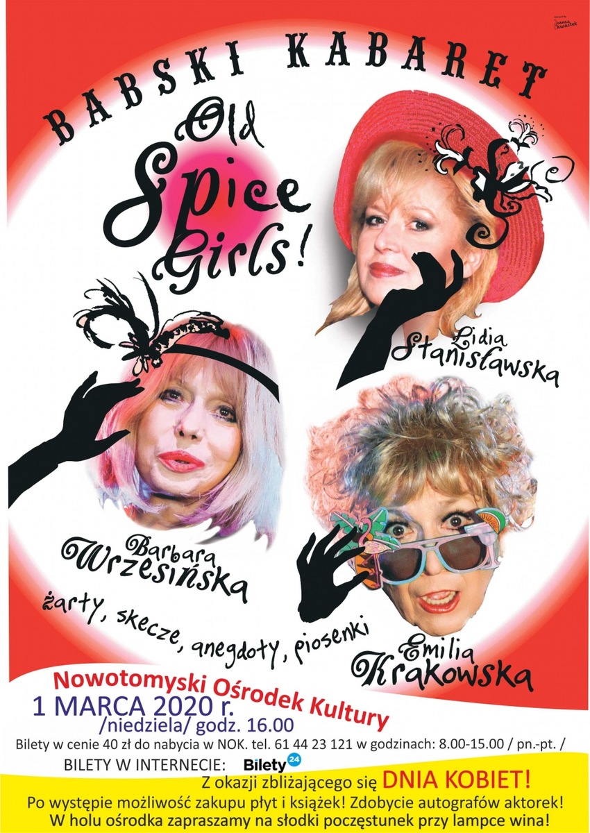 Śmiech przedłuża życie, zapewnia zdrowie i poprawia samopoczucie, stąd stały jego deficyt! Porcję szczerego śmiechu zapewni Państwu spektakl kabaretowy ”OLD SPICE GIRLS”, czyli Babski Kabaret. To kabaret z kobietami, dla kobiet i o kobietach, ale zapewne panowie również nie będą się nudzić. W rolach głównych występują: Lidia Stanisławska, Emilia Krakowska oraz Barbara Wrzesińska.