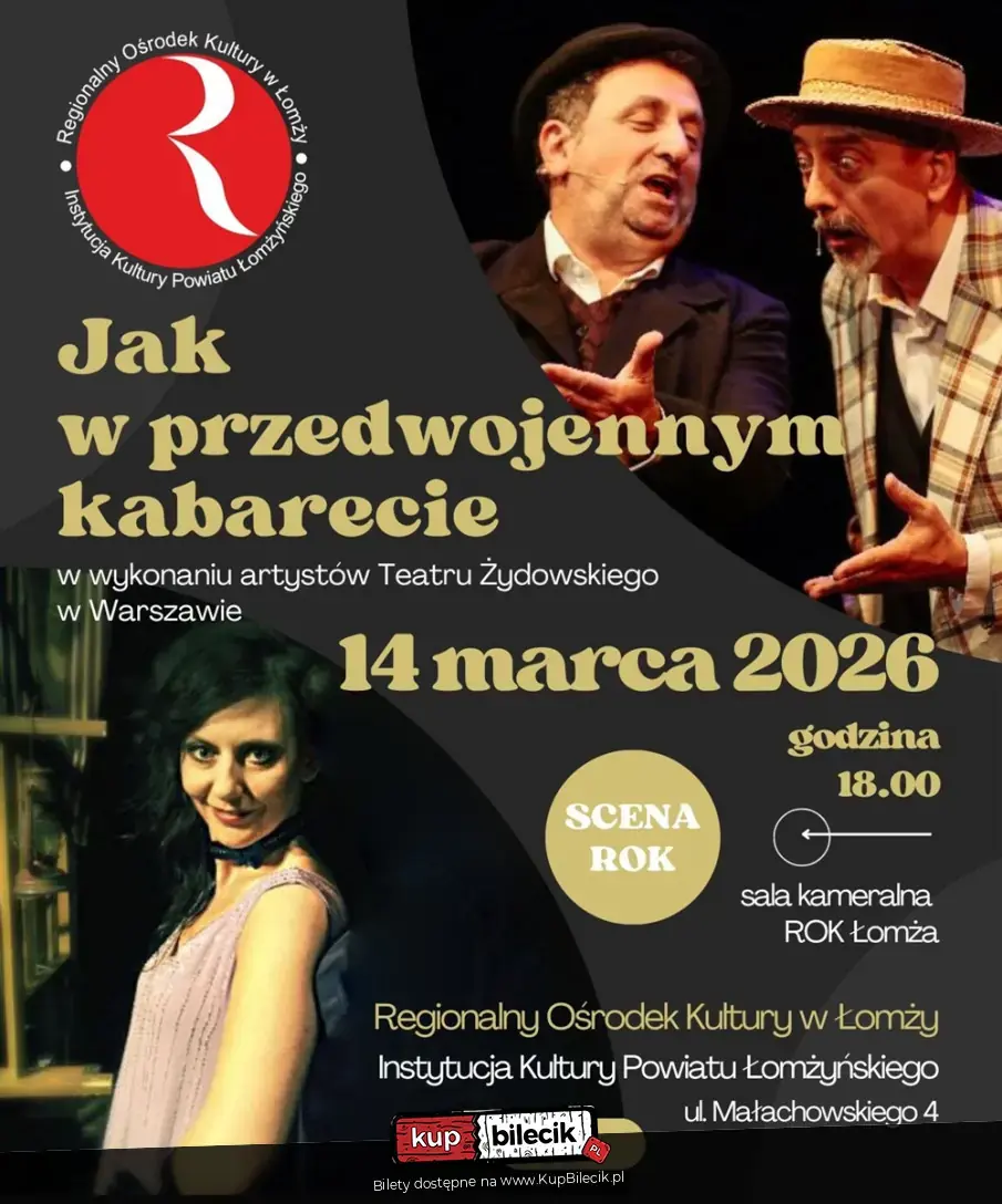 Serdecznie zapraszamy na spektakl kabaretowo-muzyczny "Jak w przedwojennym kabarecie" w wykonaniu artystów Teatr Żydowski w Warszawie. To wyjątkowa podróż do złotej ery polskiego kabaretu - świata błyskotliwego humoru, inteligentnej satyry, nastrojowej piosenki żydowskiej oraz pięknej tradycji przedwojennej estrady. W programie znajdą się klasyczne skecze, monologi i utwory muzyczne autorstwa wybitnych twórców dwudziestolecia międzywojennego, m.in. Julian Tuwim oraz Antoni Słonimski. Spektakl w wykonaniu znakomitych artystów Teatru Żydowskiego to gwarancja wysokiego poziomu artystycznego oraz wieczoru pełnego eleganckiej, inteligentnej rozrywki.