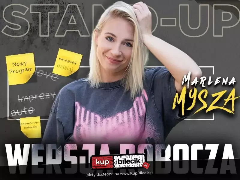 Marlena Mysza wystąpi dla Was ze swoim najnowszym programem stand-upowym "Wersja robocza". +open mic * Nie drukuj biletu, bądź EKO! Wystarczy, jak pokażesz bilet w telefonie. * Osoby przeszkadzające podczas występu będą wypraszane z sali, bez możliwości ubiegania się o zwrot pieniędzy za zakupiony bilet. * Obowiązuje całkowity zakaz nagrywania występu. * Zakup biletu jest równoznaczny z akceptacją powyższych punktów.