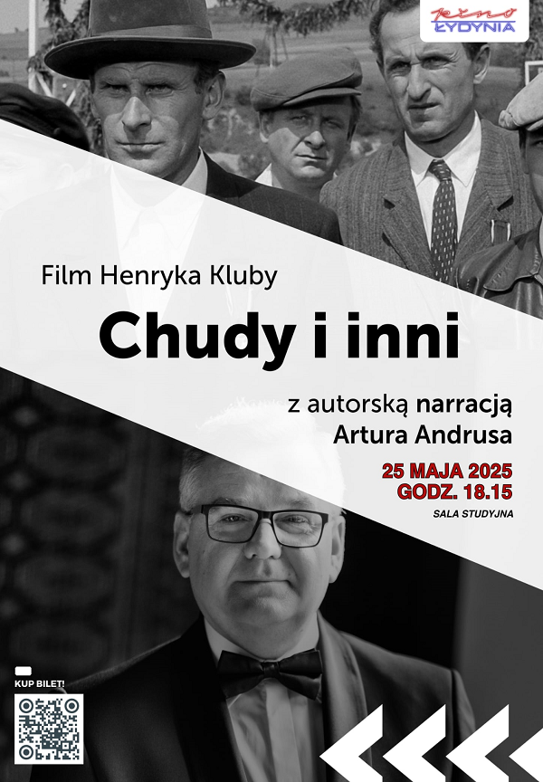 „CHUDY I INNI” Z AUTORSKĄ NARRACJĄ ARTURA ANDRUSA Połowa lat sześćdziesiątych. Trwa budowa zapory wodnej w Solinie. Spartańskie warunki, trudności z zaopatrzeniem, błoto, pustka dookoła. Grupa mężczyzn zatrudniona do pracy mimo początkowej niechęci zaczyna nawiązywać przyjacielskie relacje. Gatunek: dramat Czas trwania: 91 min. Produkcja: Polska Od lat: 12*******