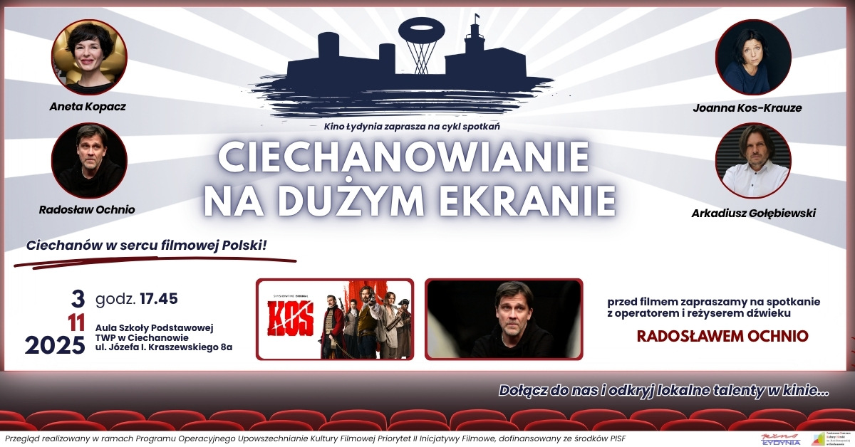 UWAGA!W zwiąku z rozbudową Kina "Łydynia" tymczasowa sala kinowa znajduje się w szkole TWP ul. Kraszewskiego 8A ___________________________________________________________________________________ Zapraszamy na kolejną odsłonę przeglądu „Ciechanowianie na dużym ekranie” 3 listopada o godz. 17:45 pokażemy film „Kos” – nagradzany dramat w reżyserii Pawła Maślony, opowiadający o ostatnich dniach Tadeusza Kościuszki Przed seansem spotkamy się z wyjątkowym gościem – Radosławem Ochnio, znanym operatorem dźwięku, który podzieli się kulisami pracy nad filmem i zdradzi, jak wygląda praca dźwiękowca na planie dużej produkcji Spotkanie poprowadzi reżyserka Aneta Kopacz Nie przegapcie okazji, by zobaczyć świetne kino i porozmawiać z jednym z jego twórców...