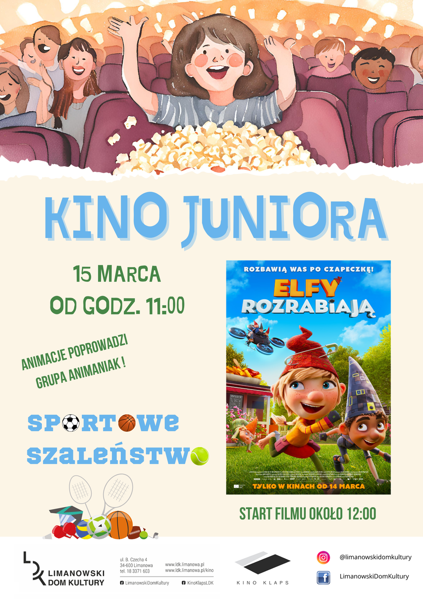 Już 15 marca zapraszamy najmłodszych kinomanów na kolejne spotkanie w ramach Kina Juniora! To wyjątkowy cykl wydarzeń, w których łączymy dobrą zabawę z filmowymi emocjami. Tradycyjnie zaczynamy o godz. 11:00 – na początek czeka nas energetyczna zabawa z grupą Animaniak, która przygotowała dla dzieci animacje pod hasłem „Sportowe szaleństwo”. Będzie dużo ruchu, śmiechu i pozytywnej energii! Po zakończeniu zabaw zapraszamy na premierowy seans filmu „Elfy rozrabiają” – pełnej humoru i przygód historii, która na pewno przypadnie do gustu wszystkim małym widzom. Elfi należy do zgranej ekipy elfów, które mieszkają w wielkim mieście. Przemykając się między wysokimi budynkami, służą swoją drobną pomocą mieszkającym tam ludziom i pozornie zwyczajne...