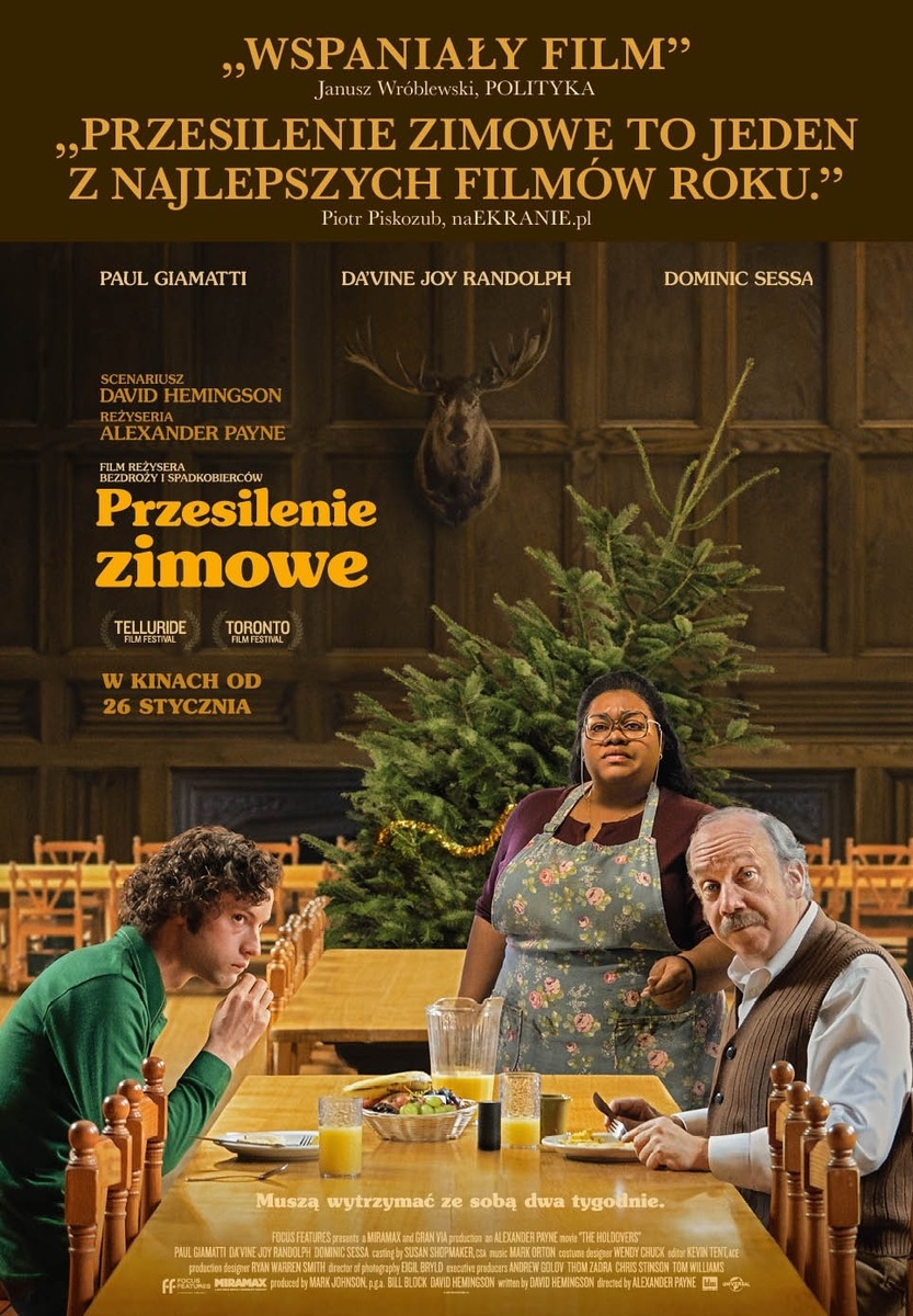 reżyseria: Alexander Payne występują: Paul Giamatti, Dominic Sessa, Da’Vine Joy Randolph, Carrie Preston / USA / dramat, komedia / 2023 / 133 min. W pierwszych scenach filmu poznajemy antypatycznego profesora historii (Paul Giamatti). Akcja filmu toczy się w szkole z internatem, gdzieś w Nowej Anglii lat 70., w przeddzień przerwy świątecznej. Spędzić Nowy Rok w tej skostniałej, zmrożonej tradycją instytucji pod opieką belfra to najgorsza kara z możliwych. Jednak stopniowo, wraz z topniejącym śniegiem i wypitą whisky relacje między uczniami i pracownikami, będącymi niczym relikty minionego świata, zaczynają się ocieplać. Z konfrontacji i szczerej rozmowy rodzi się wzajemne zrozumienie. A wszystko to zostało okraszone cytatami z dzieł greckich...