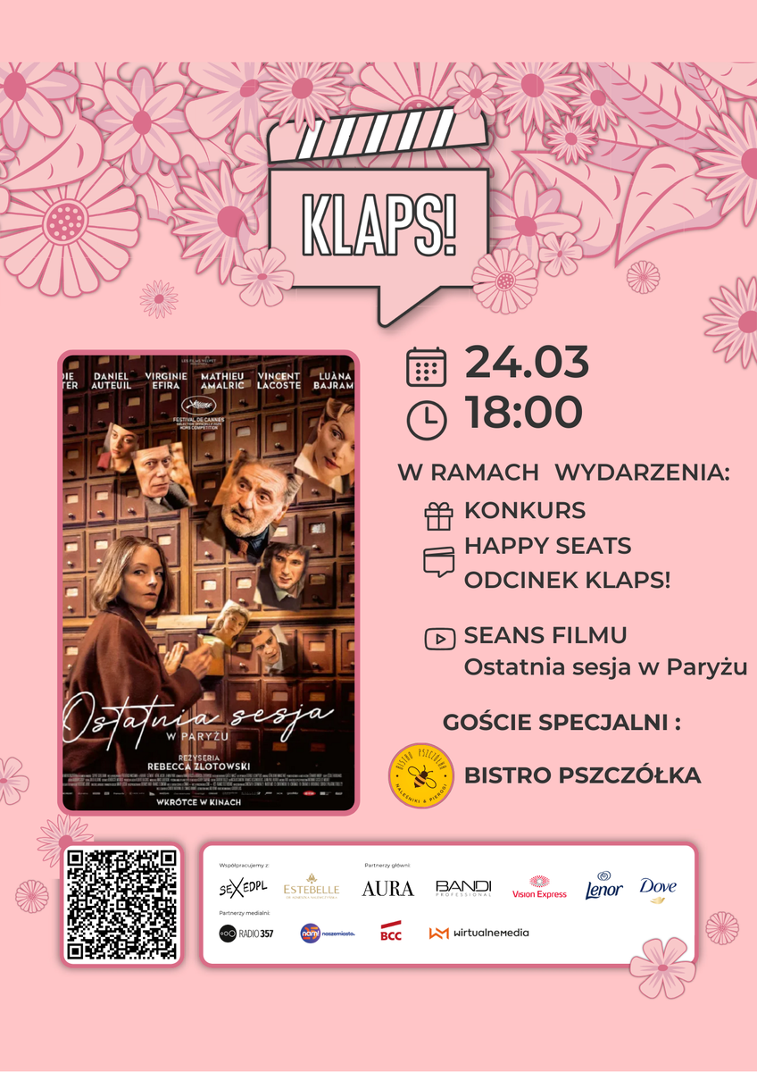 Serdecznie zapraszamy na Projekt Klaps w Kinie Bajka w Kluczborku! To seria 10-minutowych spotkań poświęconych edukacji w zakresie zdrowia seksualnego oraz relacji międzyludzkich. 18:00 Rozpoczęcie poczestunek 18:15 10 minutowy fimik KLAPS! Fantastyczne niespodzianki i prezenty 18:30 Film Ostattnia sesja w Paryżu: Lilian (laureatka Oscara Jodie Foster) jest cenioną psychiatrą prowadzącą własną praktykę w Paryżu. Jej uporządkowany świat zaczyna się rozpadać po nagłej śmierci wieloletniej pacjentki. Czy było to samobójstwo, morderstwo, a może tragiczna pomyłka lekarska? Dręczona wątpliwościami i poczuciem winy Lilian rozpoczyna prywatne śledztwo, wciągając w nie byłego męża (Daniel Auteuil). *SEANSE WYŚWIETLAMY OD MINIMUM 5 WIDZÓW*******
