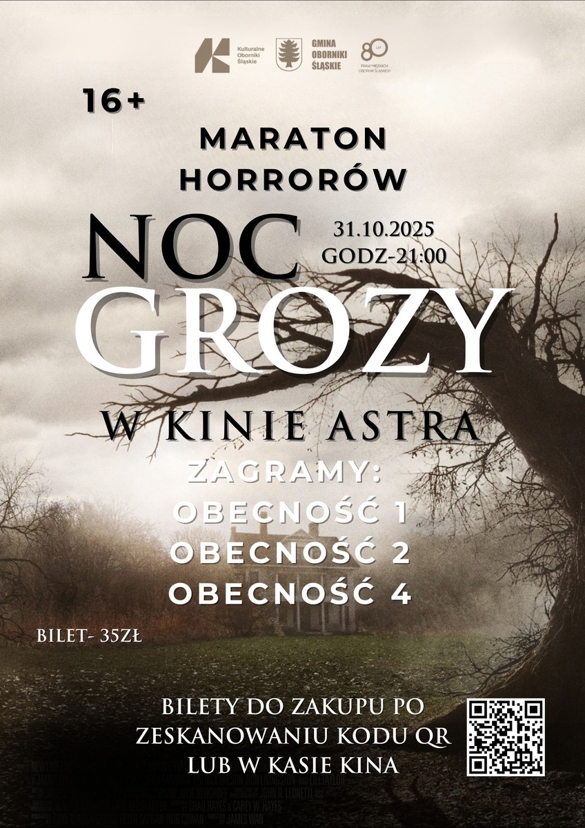 NOC GROZY - MARATON HORRORÓW Wiek: 16+ (osoby niepełnoletnie powyżej 16. r.ż. muszą mieć ze sobą pisemną zgodę opiekunów prawnych - wzór do pobrania poniżej: https://tiny.pl/10_t1spy W programie: "Obecność" - Słynna para badaczy zjawisk paranormalnych zostaje poproszona o pomoc rodzinie, którą terroryzuje potężny demon. "Obecność 2" - Lorraine i Ed Warren udają się do północnej części Londynu, aby pomóc samotnej matce wychowującej czwórkę dzieci, której dom jest nawiedzany przez złośliwe duchy. "Obecność 4. Ostatnie namaszczenie" - Ed i Lorraine, znani badacze zjawisk paranormalnych, stają wobec najbardziej przerażającej sprawy w swojej karierze. Czas trwania z przerwami ok. 400 minut*******
