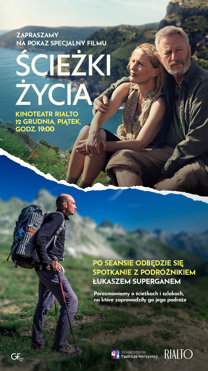 Są ścieżki, które wybieramy sami i takie, na które rzuca nas los. O jednych i drugich opowiemy podczas tego wyjątkowego wieczoru! Gutek Film we współpracy z Kinoteatrem Rialto oraz Stowarzyszeniem Twórcze Horyzonty zapraszają na spotkanie z człowiekiem, który o pokonywaniu dróg wie wszystko. Naszym gościem będzie Łukasz Supergan – podróżnik, alpinista, laureat Nagrody Magellana dla „Podróżnika Roku”. Łukasz opowie o szlakach, które zaprowadziły go w niezwykłe miejsca i o sile, jaką daje wędrówka. Prelekcję naszego gościa poprzedzi przedpremierowy pokaz filmu „Ścieżki życia” (w rolach głównych Gillian Anderson i Jason Isaacs). To inspirowana faktami, podnosząca na duchu historia małżeństwa, które po utracie majątku życia wyrusza na 1000-kilometrowy...