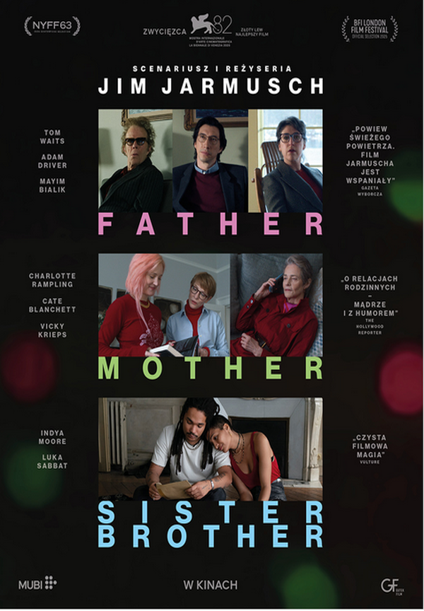 „FATHER MOTHER SISTER BROTHER" to zwycięzca ostatniego festiwalu w Wenecji i najlepszy od lat film Jima Jarmuscha, twórcy „Patersona" i „Broken Flowers". Pełen błyskotliwych obserwacji precyzyjnie skomponowany tryptyk filmowy o relacjach rodzinnych i o tym, co sprawia, że się od siebie oddalamy. Każdy z trzech rozdziałów rozgrywa się współcześnie, w innym kraju: FATHER – w północno-wschodnich Stanach Zjednoczonych, MOTHER – w Dublinie, a SISTER BROTHER – w Paryżu. Film Jarmuscha stanowi zbiór subtelnych, pełnych humoru, ale i nut melancholii portretów ludzkich charakterów. W rolach głównych m.in. Cate Blanchett, Adam Driver, Tom Waits, Vicky Krieps i Charlotte Rampling.