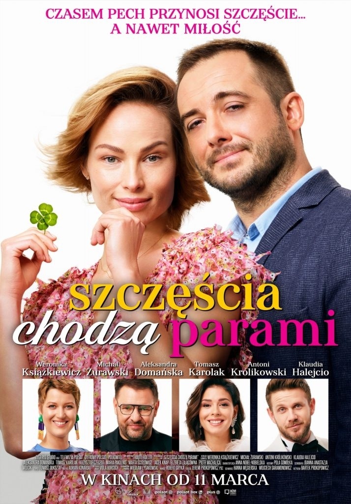 "Szczęścia chodzą parami" reż. Bartosz Prokopowicz Polska 2021 Malwina (Weronika Książkiewicz), przebojowa projektantka samochodów, zakochuje się w Brunonie (Michał Żurawski), wziętym terapeucie par. Choć potrafi on uratować każdy związek, to jego własne historie miłosne tworzą serię spektakularnych katastrof. Przystojny i zabawny, mógłby być mężczyzną marzeń, gdyby nie to, że na kobiety działa jak czarny kot. Sprowadza na swoje wybranki pecha, który z hukiem kończy najbardziej płomienny romans. Nieświadoma ryzyka Malwina, ulega jego czarowi od pierwszego wejrzenia. Mimo że w jej życiu rozpoczyna się seria niefortunnych zdarzeń, Bruno nie zamierza się tym razem poddać. Aby uratować miłość swojego życia, musi znaleźć przyczynę swoich sercowych...