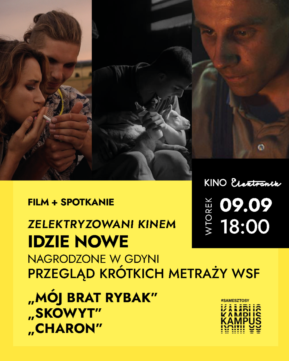 9 września, o godzinie 18:00 zapraszamy na pokaz filmów oraz spotkanie. BILET NORMALNY 15 zł BILET ULFOWY 10 zł WSTĘP WOLNY DLA OSÓB STUDIUJĄCYCH W WSF Jak często zdarza ci się oglądać krótkie metraże w kinie? To filmy-petardy, które potrzebują tylko kilkunastu minut, by dotrzeć do widza i zostać na długo w jego pamięci. Prawie niedostępne w tradycyjnej dystrybucji kinowej, możliwe do obejrzenia głównie w programach festiwali. Chcemy to zmienić! prowadzenie: Katarzyna Czajka-Kominiarczuk goście: Alicja Sokół, Kajetan Falkowski + Bartosz Brzeziński, Max Bugaja + Paweł Hejbudzki, Adam Bobik Co miesiąc na warszawskim Żoliborzu, w kultowym kinie Elektronik, Warszawska Szkoła Filmowa organizuje seanse krótkich metraży w cyklu „Idzie nowe! Pokazy...