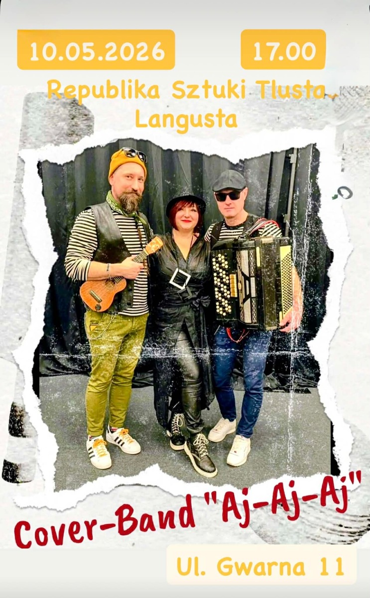 Kiedy ostatni raz odczuwaliście niesamowitą atmosferę która zachęca do tańca? Która leci z każdego akordu i dotyka każdego zakątka duszy? Jeśli stęskniliście za prawdziwą emocję oraz autentycznym niepowtarzalnym dźwiękiem-serdecznie zapraszamy na koncert Cover-band “Aj-Aj-Aj”. Zabierzemy was w wyjątkowy świat radości i pozytywnej energii, gdzie można być sobą i odczuć siebie jak w domu. Gdzie można śpiewać i odkryć swoje korzenie. Gdzie śpiewa nie tylko głos, ale dusza i serce. Gdzie można podzielić się odczuwaniem nawzajem. Do zobaczenia 10.05 o 17.00 w Republika Sztuki Tłusta Langusta na Gwarnej 11.