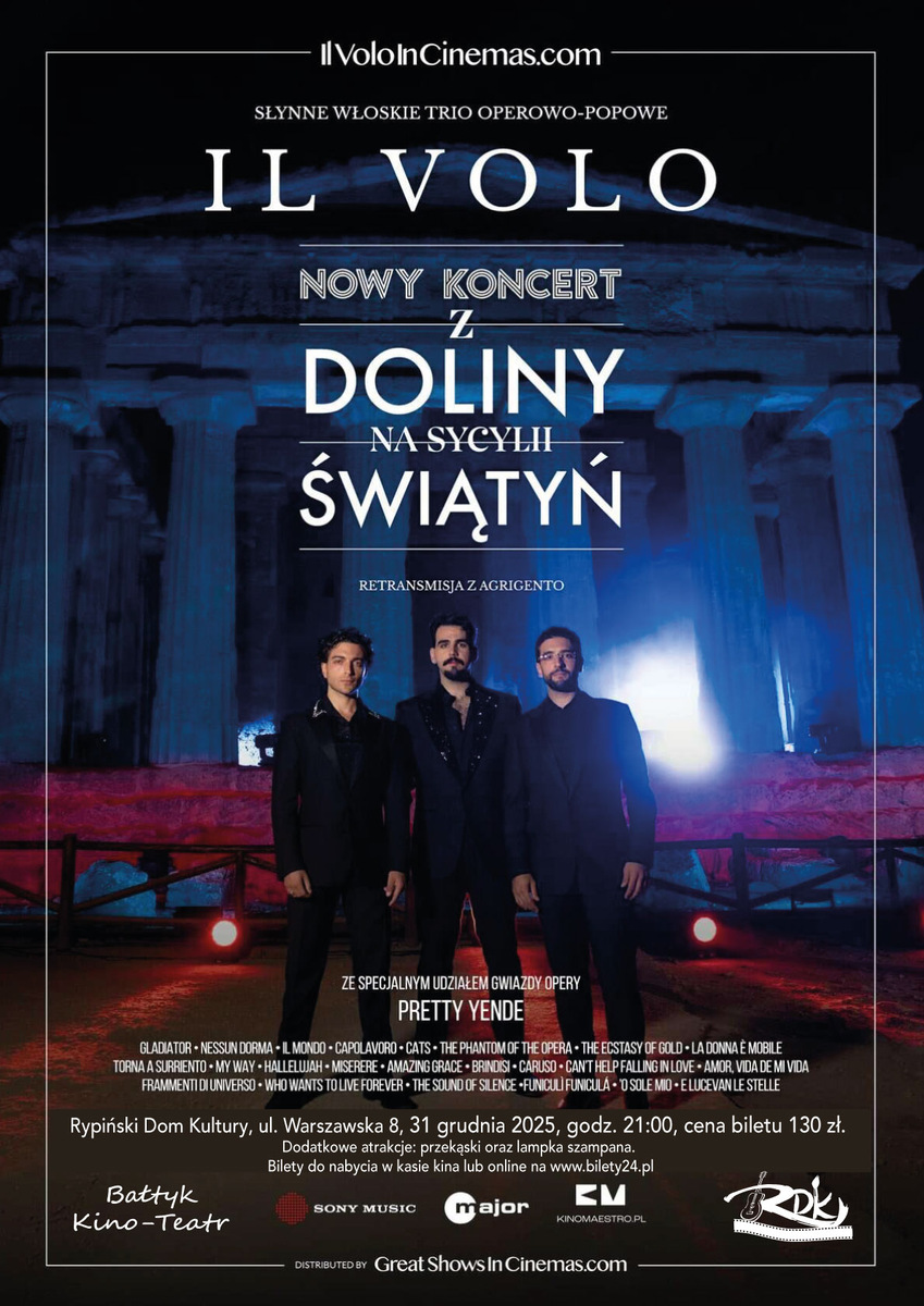 Il Volo. Najnowszy koncert z Doliny Świątyń Retransmisja letniego show z Agrigento na Sycylii 2024 Specjalna poszerzona wersja tylko dla kin Włoscy młodzi śpiewacy ponownie zachwycają publiczność! Przygotuj się na kinową retransmisję najnowszego koncertu IL VOLO i przeżyj magiczny wieczór w kinie! Przenieś się z nami na malowniczą Sycylię i posłuchaj wyjątkowego trio IL VOLO. To jedyna okazja, aby usłyszeć największe klasyki muzyki filmowej i musicalowej w tak doskonałym wykonaniu. Koncert, który łączy klasykę z popem! IL VOLO w kinie to idealny mix na sylwestrowy wieczór we włoskim klimacie. Zapraszamy 31 grudnia 2025, godz. 21:00, cena biletu 130 zł. Rypiński Dom Kultury - Kino Bałtyk, ul. Warszawska 8, Dodatkowe atrakcje: przekąski...