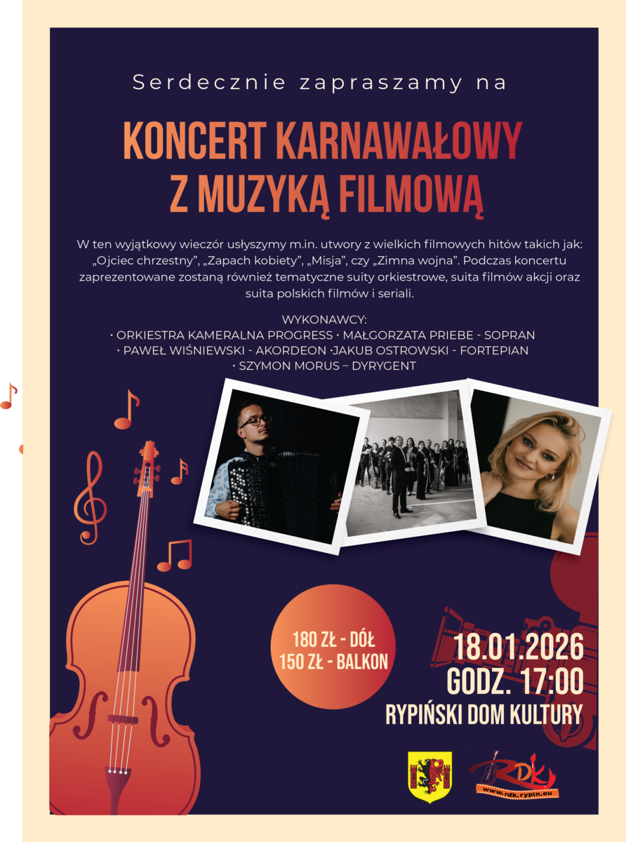 Serdecznie zapraszamy wszystkich Państwa na wyjątkowy koncert muzyki filmowej. Wyruszymy w cudowną podróż po dźwiękowych przestworzach. Podczas koncertu usłyszycie Państwo ścieżki dźwiękowe do słynnych filmów i seriali, a więc muzykę, która rozpala publiczność na całym świecie! Ten wyjątkowy koncert pozwoli docenić kunszt oraz talent najwybitniejszych kompozytorów muzyki filmowej. W podróż po dźwiękowych przestworzach zabierze Państwa Orkiestra Kameralna Progress pod batutą Szymona Morusa oraz zaproszeni goście: sopranistka Małgorzata Priebe, akordeonista Paweł Wiśniewski oraz pianista Jakub Ostrowski.*******
