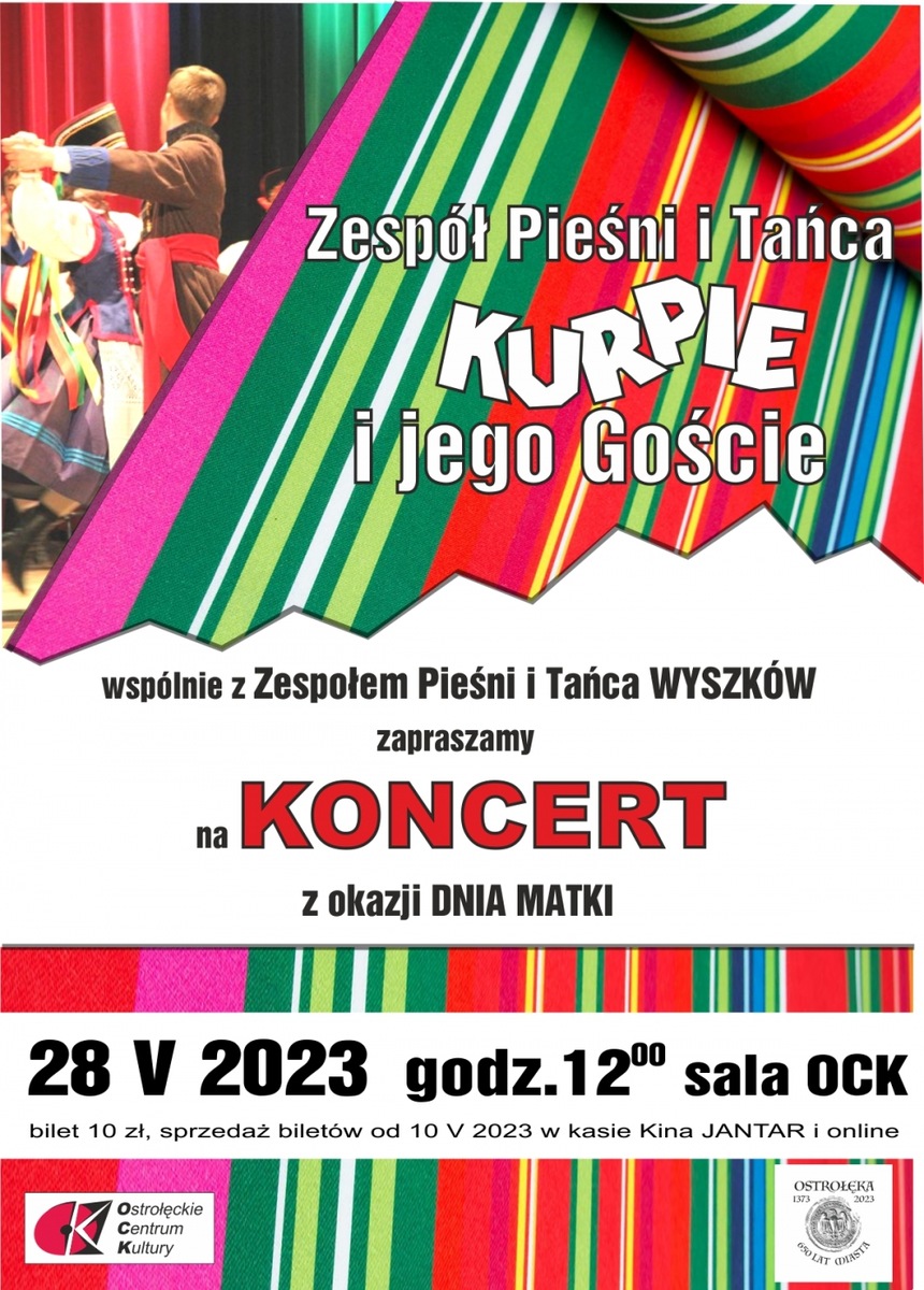 Serdecznie zapraszamy na koncert Kurpie i goście dedykowany wszystkim mamom. Obok gospodarzy zaprezentuje się Zespół Pieśni i Tańca „WYSZKÓW”. Bilety do nabycia od 10 V w kasie kina Jantar i online.*******