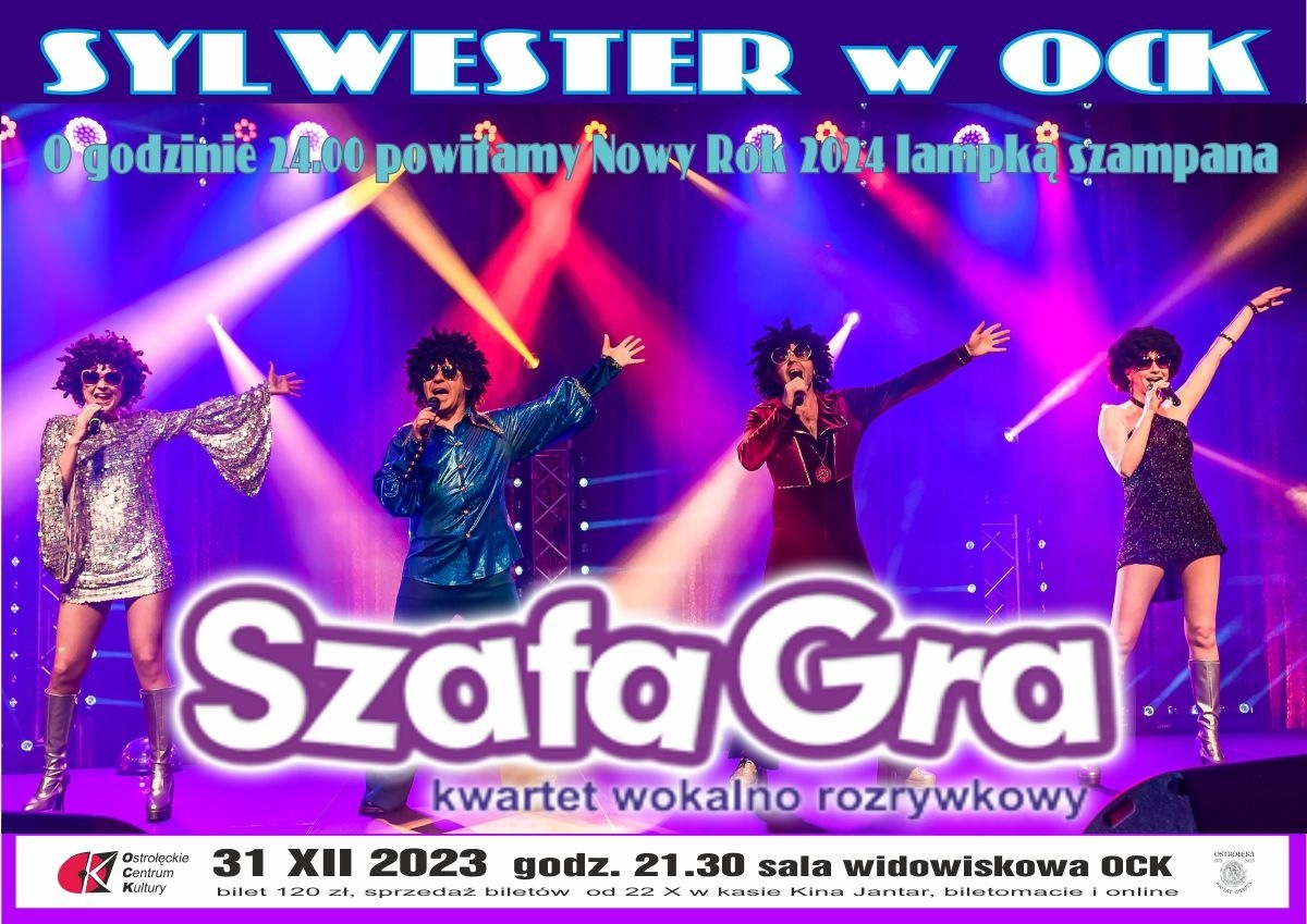 Ostrołęckie Centrum Kultury serdecznie zaprasza 31 grudnia o godz.21.30 na Koncert Sylwestrowy. W podróż z niezapomnianymi przebojami ostatnich dziesięcioleci zabierze Was kwartet wokalno rozrywkowy SZAFA GRA w składzie: Barbara Melzer, Beata Wyrąbkiewicz, Wojciech Dmochowski i Paweł Kubat Kwartet Szafa Gra rozpoczął działalność kilkanaście lat temu i do tej pory wystąpił już ponad 1000 razy. Artyści tworzący formację mają za sobą olbrzymi dorobek teatralno - estradowy. Zaczynali w kultowym musicalu Metro. Występują w teatrach Buffo i Roma oraz na deskach najlepszych teatrów muzycznych w kraju gdzie przez lata zagrali wiele głównych i pierwszoplanowych ról w takich spektaklach muzycznych jak: Do Grającej Szafy Grosik Wrzuć, Grease, Chicago, Koty, Upiór w Operze, Deszczowa Piosenka, Mamma Mia i w wielu innych. Repertuar kwartetu Szafa Gra to hity z lat 70” 80” 90” 00” i obecnych. Znakomite wykonanie wokalne, wizerunek oryginalnych wykonawców, umiejętności aktorskie i pastiszowe oraz świetny kontakt z publicznością to atuty Zespołu. Do występu przygotowanych jest kilkadziesiąt stylowych kostiumów i charakteryzacji z każdej dekady, które są dopełnieniem tego fantastycznego Show.