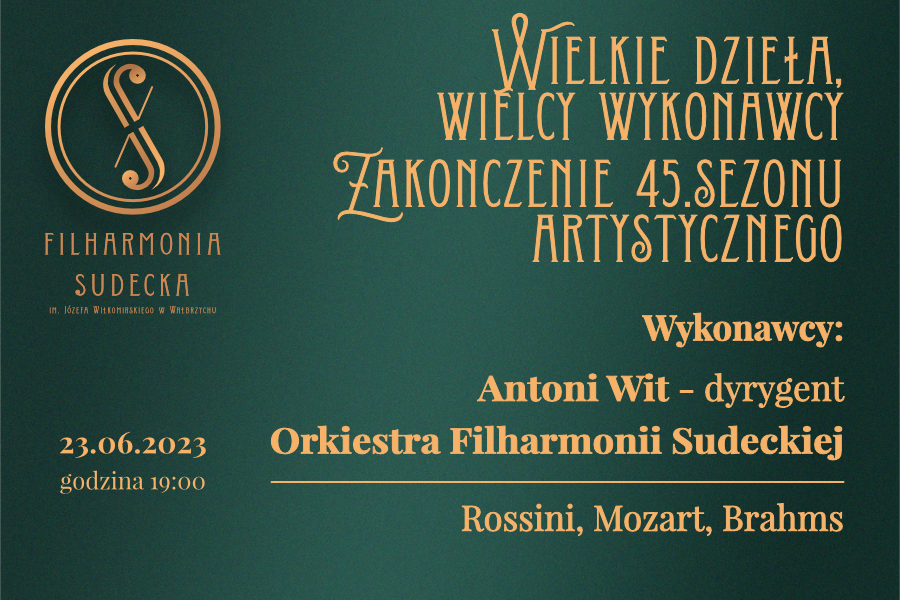 I tak oto sezon artystyczny 2022/2023 dobiegł końca. Mamy nadzieję, że nasze propozycje koncertowe spotkały się z zainteresowaniem z Państwa strony. Staraliśmy się, żeby każdy znalazł ciekawą propozycję dla siebie. Dziękując za Państwa obecność żegnamy się tylko na chwilę, aby „złapać oddech”, troszkę odpocząć i nabrać sił na nowy sezon. A teraz zostawiamy Państwa z wielkimi kompozytorami – Rossinim, Mozartem i Brahmsem, których zaprezentuje Mistrz Polskiej Batuty po raz pierwszy goszczący w Wałbrzychu, Maestro Antoni Wit.