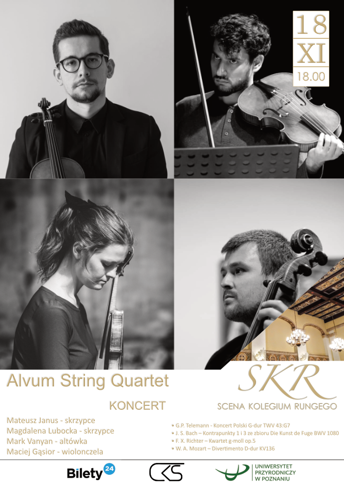 ALVUM STRING QUARTET - KLASYCZNE AKCENTY Kwartet smyczkowy, który wyróżnia wykonywanie muzyki na instrumentach historycznych. Członków zespołu, wykształconych w poznańskiej Akademii Muzycznej, połączyła fascynacja nurtem wykonawstwa historycznego. W kwartetowej współpracy muzycy kierują się poszukiwaniem autentyzmu w brzmieniu - grają na instrumentach budowanych według dawnych reguł, wykorzystując przypisaną im technikę gry z minionych epok, odpowiednie smyczki i struny jelitowe. Zgłębiają tajniki wykonawstwa historycznego w oparciu o traktaty muzyczne i inne źródła wiedzy sprzed setek lat, aby możliwie przybliżyć się do tego, jak mogły brzmieć dzieła baroku, klasycyzmu i preromantyzmu w czasach swojego powstawania oraz zaprosić dzisiejszą...