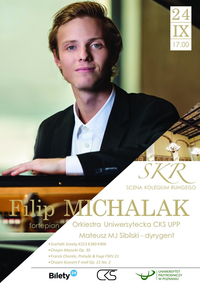 Filip Michalak – Koncert jest pierwszym tego artysty w Poznaniu, wydarzeniem specjalnym otwierającym sezon artystyczny na Scenie Kolegium Rungego UPP. Będzie to okazja, aby na żywo posłuchać jego recitalu z Mazurkami Chopina, Sonatami Scarlattiego i wspólnego z Orkiestrą Uniwersytecką CKS UPP pod dyrekcją Mateusza MJ Sibilskiego wykonania Koncertu F moll Op. 21 No. 2 Fryderyka Chopina. Występ zapowiada się niezwykle emocjonująco bowiem artyści zaplanowali specjalną jego aranżacje autorstwa Kevina Kennera. Filip Michalak – to duńsko - polski pianista, jeden z najzdolniejszych pianistów młodego pokolenia. Zwycięzca międzynarodowych konkursów, który dał się poznać jako jeden z czołowych młodych pianistów Skandynawii. Aktywny...