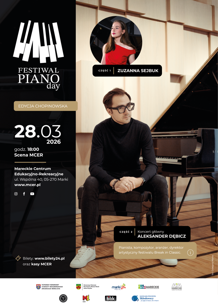 Zapraszamy na IV edycję Festiwalu Piano Day, poświęconą twórczości Fryderyka Chopina. W pierwszej części koncertu wystąpi finalistka Ogólnopolskiego Konkursu Chopinowskiego- Zuzanna Sejbuk, a gwiazdą wieczoru będzie pianista, kompozytor i aranżer- Aleksander Dębicz. Koncert odbędzie się już 28 marca 2026 r. o godz. 18.00 w Mareckim Centrum Edukacyjno-Rekreacyjnym. Data wydarzenia nie jest przypadkowa. Festiwal organizujemy co roku na cześć międzynarodowego święta fortepianu, hucznie obchodzonego na całym świecie 88. dnia roku – liczba ta odpowiada liczbie klawiszy tego pięknego instrumentu. Aleksander Dębicz – pianista, kompozytor, aranżer i dyrektor muzyczny – należy do najbardziej wszechstronnych i innowacyjnych artystów polskiej sceny....