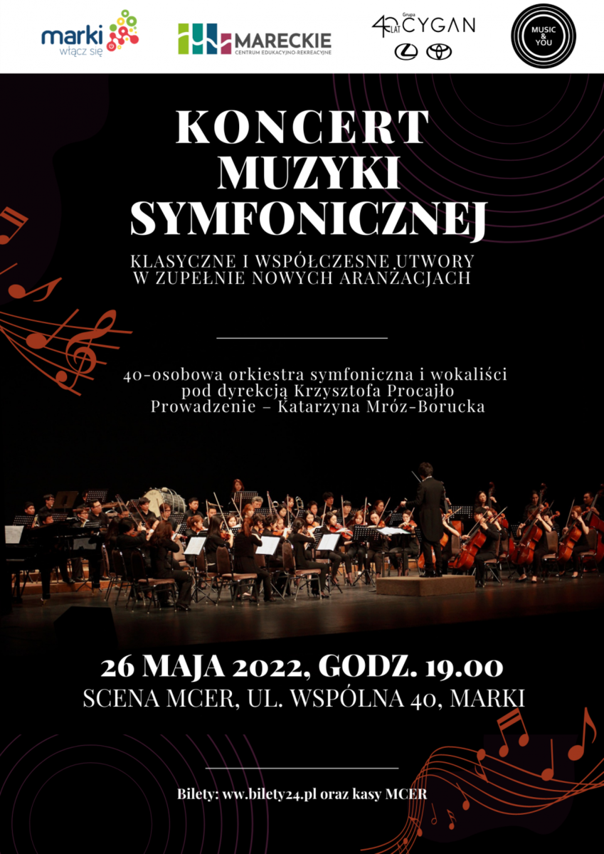 Już 26 maja 2022 r. o godz. 19.00 w Mareckim Centrum Edukacyjno-Rekreacyjnym odbędzie się wyjątkowy koncert muzyki symfonicznej. Aż 40 muzyków wykona klasyczne i współczesne utwory w zupełnie nowych aranżacjach. Wykonawcy: Orkiestra symfoniczna – 36-osobowa pod dyrekcją Krzysztofa Procajło Oraz wokaliści: Patrycja Ciborowska, Emilia Cyran, Dawid Pelowski, Zuzanna Lenkiewicz Prowadzenie – Katarzyna Mróz-Borucka Podczas koncertu będzie można usłyszeć m.in.: Polonez (W.Kilar) Cztery pory roku - Wiosna (1st mov.) A.Vivaldi Libertango A.Piazzolla River Flows in You Yiruma Con te partiro (Time to say goodbye) Andrea Bocelli Jezioro łabędzie (temat - Scene, Act.2) P. I. Tchaikovsky Rondo alla Turca (K.331 - Mozart), W. A. Mozart Heal the world,...