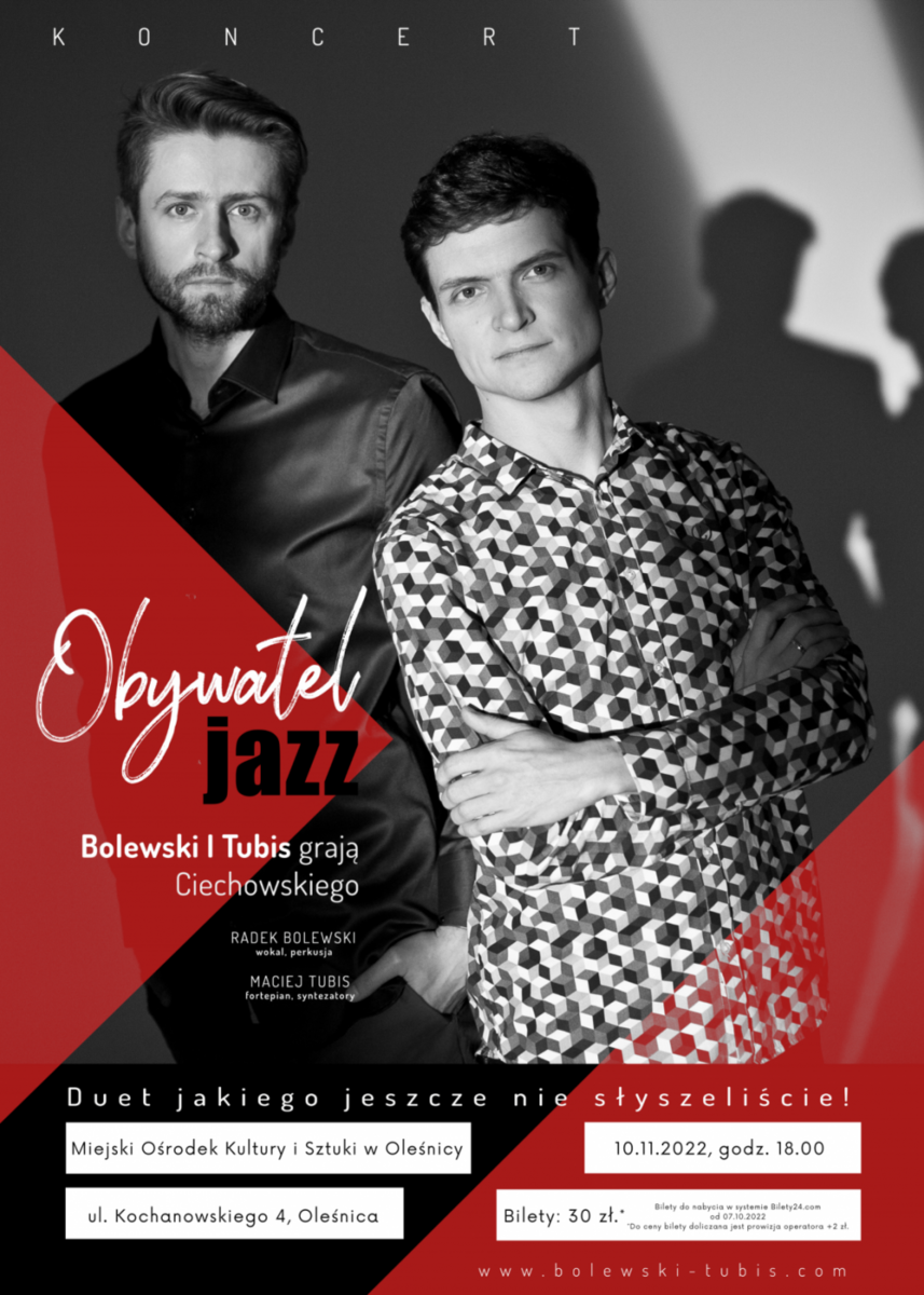 Bolewski & Tubis to wyjątkowy i oryginalny w skali kraju duet, Radosław Bolewski - wokal, perkusja oraz Maciej Tubis - fortepian i syntezator basowy. Ich muzyka określana jest jako wysmakowany balans między jazzem a muzyką pop w odważnej improwizowanej odsłonie. Bolewski & Tubis ma na koncie doskonale przyjęty projekt "Obywatel Jazz" poświęcony twórczości Grzegorza Ciechowskiego z którym od 2021 roku koncertuje w wielu miastach Polski, m. in.: Radio 357 czy Dni Grzegorza Ciechowskiego w Toruniu.