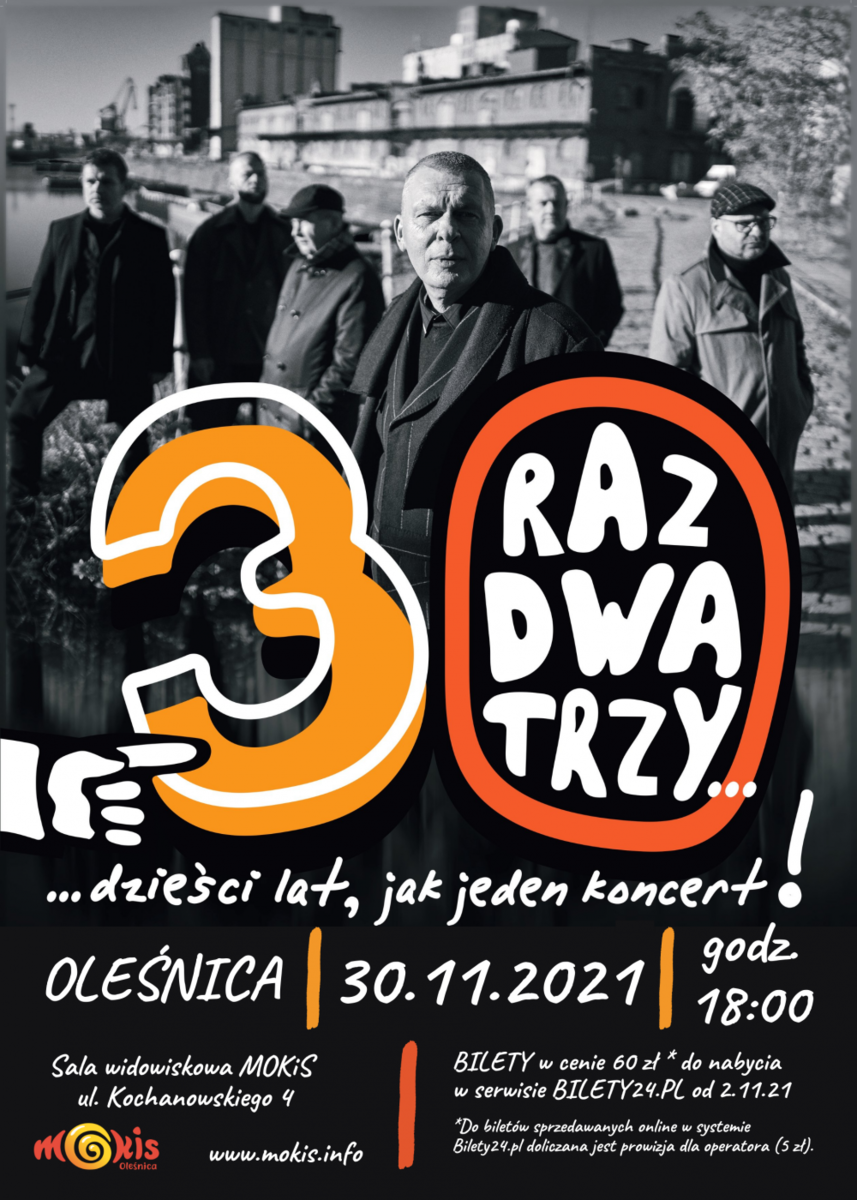 Zapraszamy 30 listopada 2021 roku o godzinie 18.00 do sali widowiskowej MOKiS w Oleśnicy, na koncert zespołu RAZ DWA TRZY.