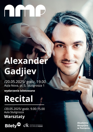 Wystąpi: Alexander Gadjiev Program: F. Chopin – Mazurki op. 63/2, op. 6/3, op. 24/4, op. 6/1, op. 50/3 R. Schumann – Arabesque C-dur op. 18 F. Chopin – Polonez As-dur op. 53 R. Schumann – Die Gesänge der Frühe op. 133 C. Debussy – Preludia: Broillards, Ondine, La Terrasse des audiences du clair de lune, Feux d’artifice B. Bartók – Out of Doors, Sz. 81 Alexander Gadjiev urodził się 23 grudnia 1994 r. Po z górą dziesięciu latach nauki u ojca Siavusha Gadjieva studiował w Mozarteum w Salzburgu w klasie Pavla Gililova, a obecnie składa egzaminy koncertowe w Hanns Eisler Hochschule w Berlinie pod kierunkiem Eldara Nebolsina. Jest Artystą Nowego Pokolenia BBC (2019–2022). Zdobywca I nagród prestiżowych konkursów pianistycznych: IX Międzynarodowego...