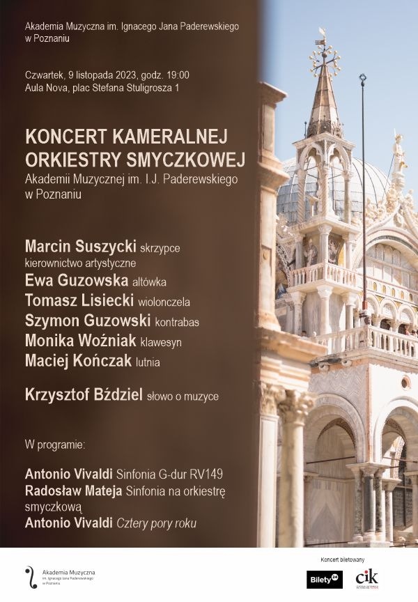 Zapraszamy na koncert Kameralnej Orkiestry Smyczkowej Akademii Muzycznej im. Ignacego Jana Paderewskiego w Poznaniu. Program: Antonio Vivaldi – Sinfonia G-dur RV 149 Monika Kędziora – ….. (prawykonanie) Antonio Vivaldi – Cztery pory roku (Le quattro stagioni) op. 8 Marcin Suszycki – skrzypce, kierownictwo artystyczne Opieka merytoryczna: prof. S. Kamiński, mgr M. Suszycki *******