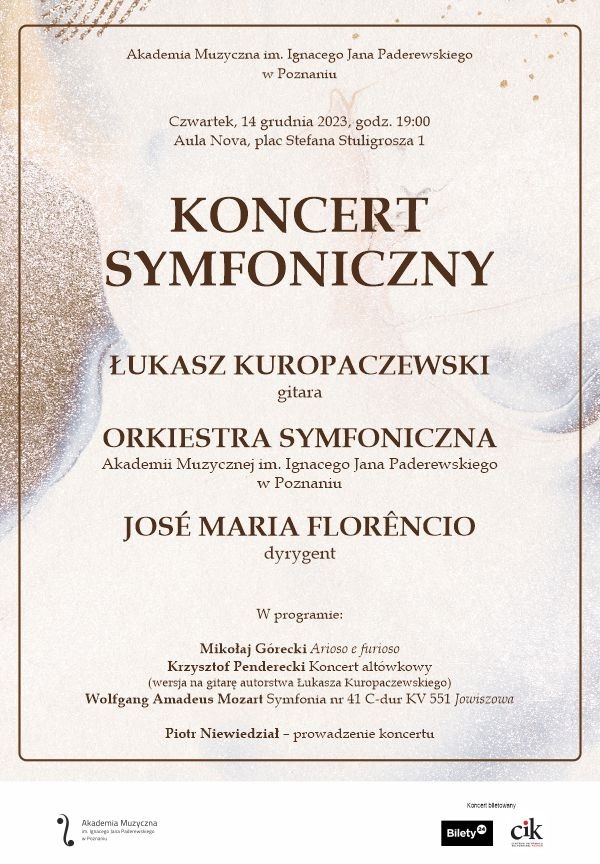 Wystąpią: Orkiestra Symfoniczna Akademii Muzycznej José Maria Florêncio - dyrygent Łukasz Kuropaczewski - gitara Program: Mikołaj Górecki - Arioso e furioso Krzysztof Penderecki - Koncert altówkowy (wersja w ar. na gitarę autorstwa Łukasza Kuropaczewskiego) Wolfgang Amadeus Mozart - Symfonia nr 41 C-dur, KV 551 - Jowiszowa*******