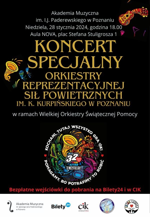 Koncert specjalny Orkiestry Reprezentacyjnej Sił Powietrznych im. K. Kurpińskiego pod dyrekcją ppłk Pawła Joksa w ramach Wielkiej Orkiestry Świątecznej Pomocy. W czasie koncertu zabrzmią największe przeboje muzyki filmowej, takich kompozytorów jak Ennio Morricone czy Hans Zimmer.
