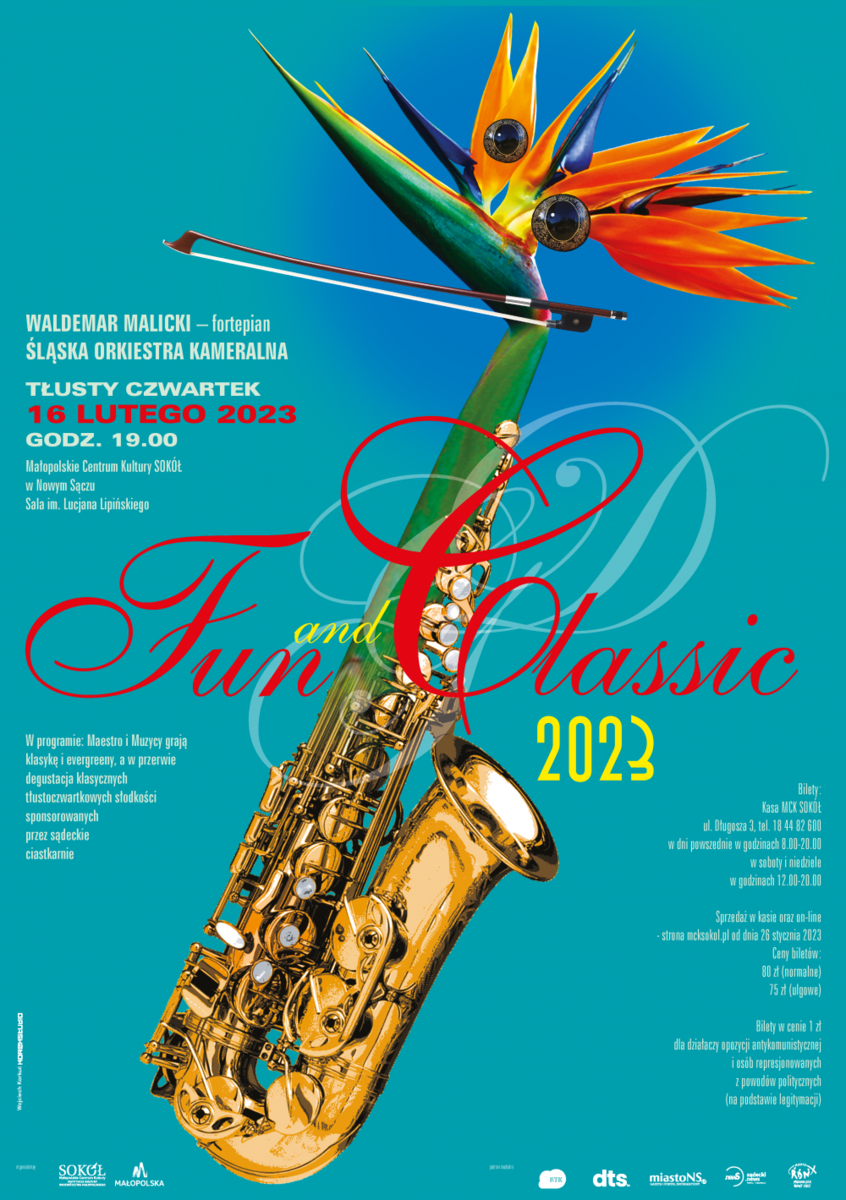 16 lutego zapraszamy na koncert pełen wirtuozerii i żartu muzycznego w wykonaniu wszystkim dobrze znanego pianisty Waldemara Malickiego i Śląskiej Orkiestry Kameralnej. W programie: Maestro i Muzycy grają klasykę i evergreeny, a w przerwie degustacja klasycznych tłustoczwartkowych słodkości sponsorowanych przez sądeckie ciastkarnie.