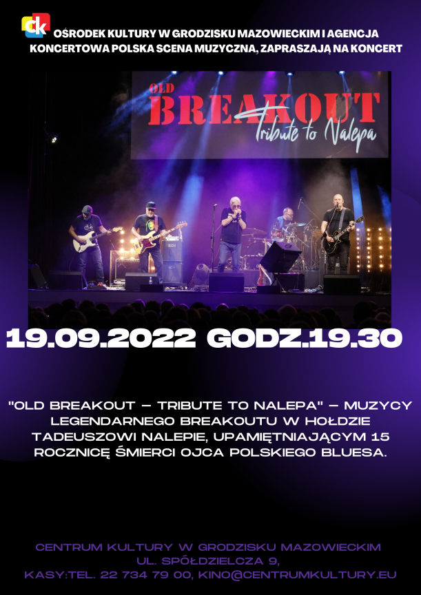 “OLD BREAKOUT – Tribute to Nalepa” – muzycy legendarnego Breakoutu w hołdzie Tadeuszowi Nalepie, upamiętniającym 15 rocznicę śmierci Ojca Polskiego Bluesa. OLD BREAKOUT to reaktywacja legendy – muzyczna inicjatywa członków oryginalnego składu BREAKOUT – założonej przez Tadeusza Nalepę legendy polskiej sceny blues-rockowej z lat siedemdziesiątych. W 1970 roku Tadeusz Trzciński, na prośbę Tadeusza Nalepy, kompletuje skład do (jak się okazało) jednej z najważniejszych płyt w historii polskiego bluesa. Powstaje przełomowy album “Blues Breakout”, nagrany w składzie: Tadeusz Nalepa – śpiew, gitara, Tadeusz Trzciński -harmonijka ustna, Dariusz Kozakiewicz – gitara, Jerzy Goleniewski – gitara basowa, Józef Hajdasz – perkusja, z tekstami Bogdana Loebla....