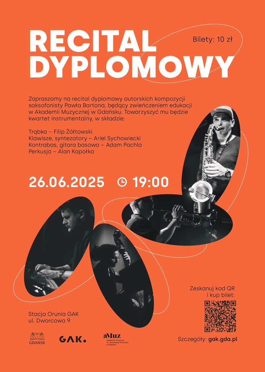 Grają: Saksofon - Paweł Barton Trąbka - Filip Żółtowski Klawisze, syntezatory - Ariel Sychowiecki Kontrabas, gitara basowa - Adam Pachla Perkusja - Alan Kapołka Paweł Barton - student V roku Akademii Muzycznej w Gdańsku na kierunku Jazz i Muzyka Estradowa, specjalność saksofon jazzowy w klasie prof. dr hab. Macieja Sikały - i jego zespól. W ramach obrony pracy magisterskiej odbędzie się recital dyplomowy będący podsumowaniem pięciu lat nauki w Akademii. Koncert obejmie wyłącznie autorskie kompozycje, wykonane w kwintecie. Bilety w cenie 10,00 zł są dostępne on-line oraz w Recepcji Stacji Orunia (Dworcowa, 9)*******