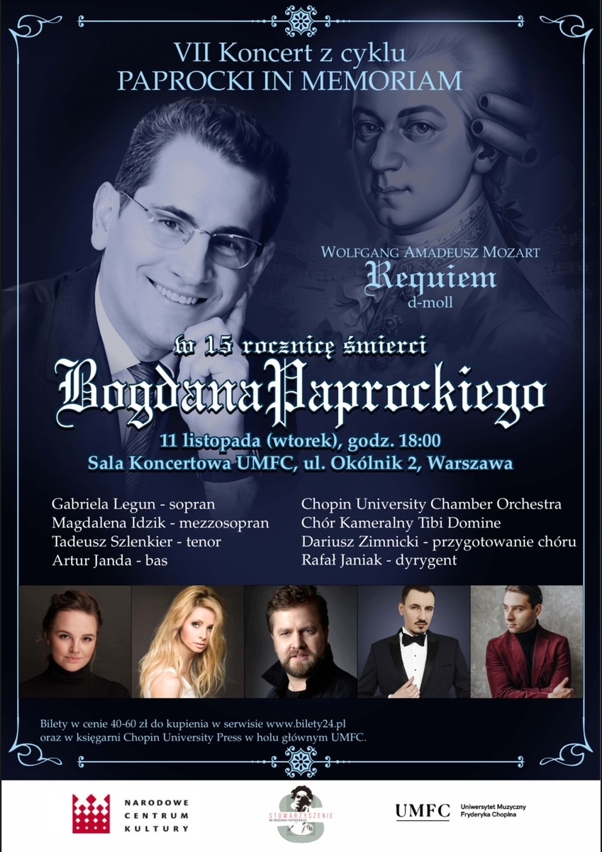 Requiem W.A. Mozarta to hołd, jaki Stowarzyszenie im. Bogdana Paprockiego składa swojemu patronowi w 15 rocznicę Jego śmierci. To arcydzieło muzyki sakralnej w tym roku zyskało nową odsłonę. VII edycja cyklu "Paprocki in memoriam" to również znakomici soliści. Gabriela Legun - sopran, Magdalena Idzik - mezzosopran, Tadeusz Szlenkier - tenor i Artur Janda - bas po raz pierwszy wystąpią w goscinnych progach Uniwersytetu Muzycznego Fryderyka Chopina w Warszawie, który oprócz sali o doskonałej akustyce udostępnia również swoją orkiestrę kameralną, którą poprowadzi Maestro Rafał Janiak. Całości dopełni chór "Tibi Domine" przygotowany przez Dariusza Zimnickiego.