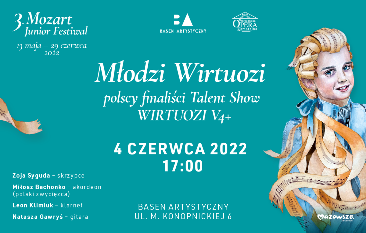 Młodzi Wirtuozi – polscy finaliści Talent Show WIRTUOZI V4+ 3. Mozart Junior Festiwal w Warszawie Basen Artystyczny Warszawskiej Opery Kameralnej Występują: Zoja Syguda – skrzypce Miłosz Bachonko – akordeon (polski zwycięzca) Leon Klimiuk – klarnet Natasza Gawryś – gitara PROGRAM: Zoja Syguda – skrzypce H. Wieniawski – Wariacje na temat własny op.15 W. A. Mozart Koncert – skrzypcowy G – dur KV 216 cz.1 (bez kadencji) Miłosz Bachonko – akordeon W. A. Mozart – Uwertura do opery Wesele Figara Antonio Vivaldi – Cztery pory roku – Zima Miłosz Bachonko – Toccata c-moll, nr. 3 Leon Klimiuk – klarnet koncert klarnetowy A-dur cz. II, W. A. Mozarta koncert klarnetowy B-dur Karola Kurpińskiego Natasza Gawryś – gitara W. A. Mozart...