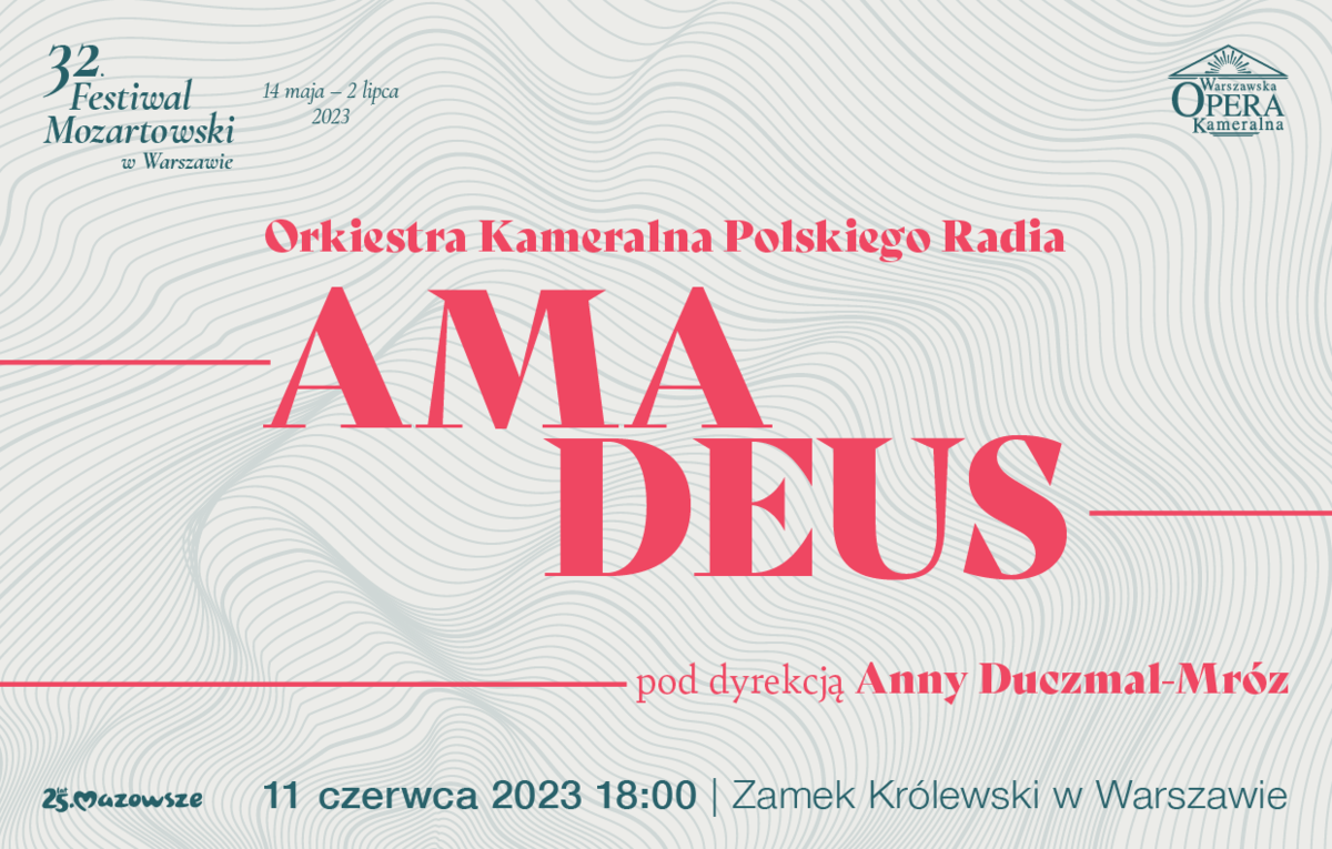 32. Festiwal Mozartowski w Warszawie Zamek Królewski w Warszawie Orkiestra Kameralna Polskiego Radia AMADEUS pod dyrekcją Anny Duczmal-Mróz W programie: C. Debussy – Preludium 8 „Dziewczyna o włosach jak len” (opr. J. Maksymiuk) O. Respighi – III Suita „Dawne tańce i arie” W. A. Mozart – Divertimento B-dur KV 137 F. Mendelssohn-Bartholdy – Oktet smyczkowy Es-dur op. 20 (ar. A. Duczmal) Dyrygent: Anna Duczmal-Mróz Anna Duczmal-Mróz po swoim debiucie na Bad Kissingen Winterzauber Festival została okrzyknięta przez niemiecką prasę „sensacyjną dyrygentką (…) jest technicznie bez skazy, dyryguje bardzo skupiona, precyzyjna i bardzo uważna (…) doskonale buduje napięcie i potrafi je utrzymać, potrafi osiągnąć...