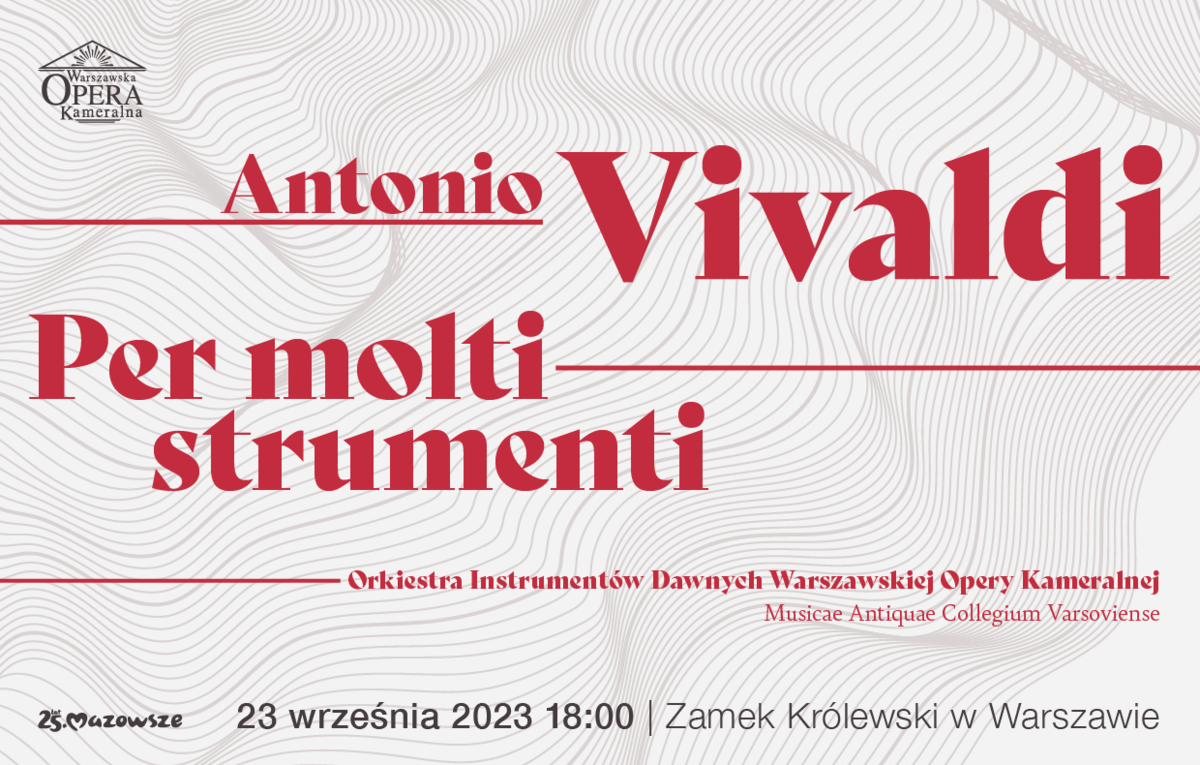 Zamek Królewski w Warszawie Antonio Vivaldi Per molti strumenti Repertuar: Antonio Vivaldi Koncert C-dur na dwa flety i orkiestrę, RV 533 Koncert h-moll na czworo skrzypiec i orkiestrę, RV 580 Koncert g-moll na flet, obój, skrzypce, fagot i basso continuo, RV 107 Koncert C-dur na mandolinę i orkiestrę, RV 425 Koncert B-dur na obój i skrzypce i orkiestrę, RV 548 Koncert g-moll na wiolonczele i violę da gamba i orkiestrę, RV 531 Występują: Orkiestra Instrumentów Dawnych Warszawskiej Opery Kameralnej Musicae Antiquae Collegium Varsoviense Grzegorz Lalek – mandolina Natalia Moszumańska, Agata Habera, Ewa Chmielewska, Aleksandra Owczarek – skrzypce Karolina Szewczykowska – wiolonczela Justyna Rekść-Raubo – viola da gamba Karolina...