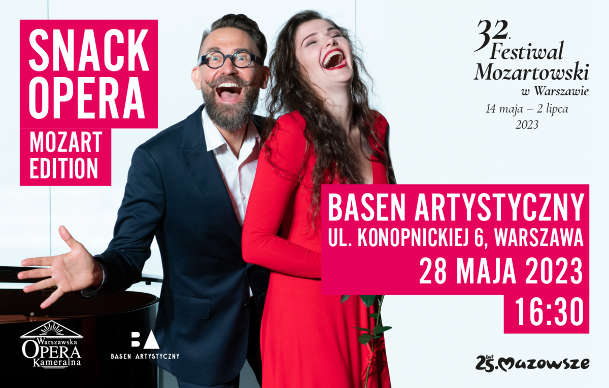 32. Festiwal Mozartowski w Warszawie Basen Artystyczny Warszawskiej Opery Kameralnej Snack Opera. Mozart Edition Muzyczna przekąska, która ma zaostrzyć apetyt na danie główne – prezentujemy Snack Operę Jerzego Snakowskiego, która odbędzie się na deskach sceny Basenu Artystycznego. Czas trwania: 75 minut Prowadzenie: Jerzy Snakowski Tym, którzy dopiero chcą zacząć swoją przygodę z operą, pomożemy przebić się przez gąszcz uprzedzeń i tajemnic, którymi otoczono ten gatunek. Melomanów zachęcimy próbą innego spojrzenia na repertuar klasyczny i ariami, które wydobędziemy z operowego lamusa. Snack Opera w Warszawie W niedzielne popołudnie czekać będzie na Państwa troje śpiewaków, jeden pianista, jeden moderator oraz...