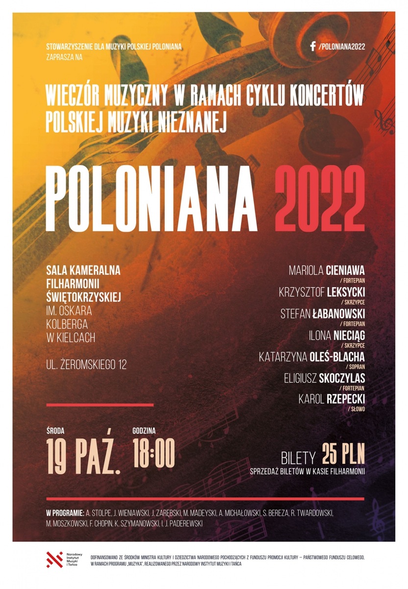Wieczór Muzyczny w ramach Cyklu Koncertów Polskiej Muzyki Nieznanej POLONIANA 2022 Wieczór Muzyczny w Sali Kameralnej Filharmonii Świętokrzyskiej to pierwszy z cyklu czterech koncertów, które odbędą się w polskich filharmoniach w październiku i listopadzie 2022 roku. Znakomici artyści: sopranistka Katarzyna Oleś-Blacha, pianiści: Mariola Cieniawa, Stefan Łabanowski i Eligiusz Skoczylas oraz skrzypkowie: Ilona Nieciąg i Krzysztof Leksycki w swych interpretacjach zaprezentują Państwu utwory wokalne, fortepianowe i kameralne mniej znanych i zapomnianych kompozytorów polskich, głównie doby romantyzmu: Antoniego Stolpego, Józefa Wieniawskiego, Juliusza Zarębskiego, Marcelego Madeyskiego, Aleksandra Michałowskiego, Maurycego Moszkowskiego, Stefana...