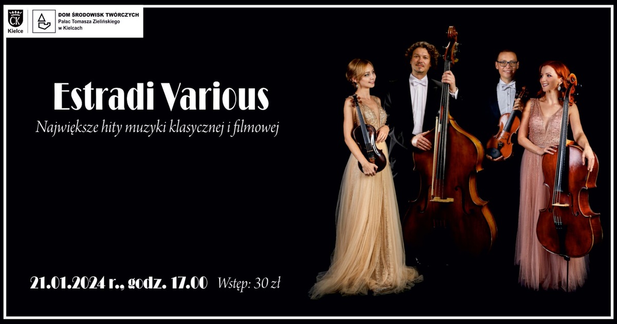 Zespół Estradi Various powstał w 2018. Skład Zespołu daje muzykom duże możliwości aranżacji, a utwory wykonane przez kwartet mają piękne, jednorodne brzmienie, wielkie bogactwo barw oraz szeroką paletę kolorystyki dźwiękowej. Kilkuletnia współpraca czwórki muzyków zaowocowała wspaniałym efektem artystycznym. Tworzą interpretacje znanych utworów klasycznych, rozrywkowych i muzyki filmowej, które na długo po koncercie goszczą w pamięci słuchaczy. Program, który usłyszymy podczas koncertu w Pałacyku będzie zawierał znane i lubiane hity muzyki klasycznej oraz muzyczne arcydzieła historii kina, których twórcy traktowani są na równi z najwybitniejszymi kompozytorami muzyki poważnej. Starannie dobrane ścieżki dźwiękowe stworzą niezapomnianą atmosferę....