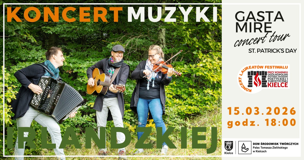 Zapraszamy na koncert muzyki irlandzkiej! Już 16 marca 2026 r. (niedziela) o godz. 18:00 sala koncertowa w Pałacyku Zielińskiego w Kielcach wypełni się energią, rytmem i klimatem zielonej wyspy. Na scenie wystąpi Gasta Mire – koncert w ramach St. Patrick’s Day Tour. Będzie żywiołowo, tanecznie i bardzo irlandzko! Gasta Mire od 2012 roku cieszą uszy słuchaczy w całej Polsce - od maleńkich górskich chatek, przez Domy Kultury, aż po sceny ogólnopolskich festiwali. Instrumentalno-wokalne trio zafascynowane Zieloną Wyspą tworzy muzykę łączącą irlandzkie melodie z tekstami inspirowanymi wędrówką człowieka przez życie. Być może to właśnie dlatego scena piosenki turystycznej tak ciepło przyjęła ich na swoje deski. Nazwa zespołu w języku gaelic...