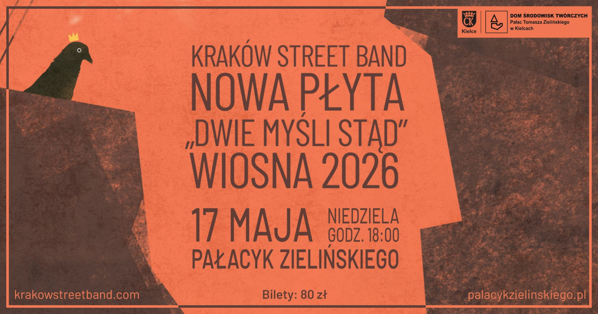 17.05.2026 r. (niedziela), godz. 18:00 Pałacyk Zielińskiego w Kielcach – scena letnia (w ogrodzie) Wstęp: 80 zł https://www.palacykzielinskiego.pl Po doskonale przyjętych, nominowanych do Fryderyka, płytach „Going Away” i „Czekanie”, Kraków Street Band powraca z nowym, długo wyczekiwanym albumem pt. „Dwie myśli stąd”. Kraków Street Band jest zespołem unikatowym, od lat wymykającym się wszelkim gatunkowym klasyfikacjom. Z jednej strony czerpie z najlepszych wzorców światowej muzyki – bluesa, jazzu, rocka, czy miejskiego folku, z drugiej jednak pobrzmiewa w nim wyraźne krakowskie echo – piosenki Kraków Street Band są poruszające, sprawne literacko i pełne treści. Siedmioosobowy skład, złożony z wirtuozów swoich instrumentów, tworzy niezwykle barwny...