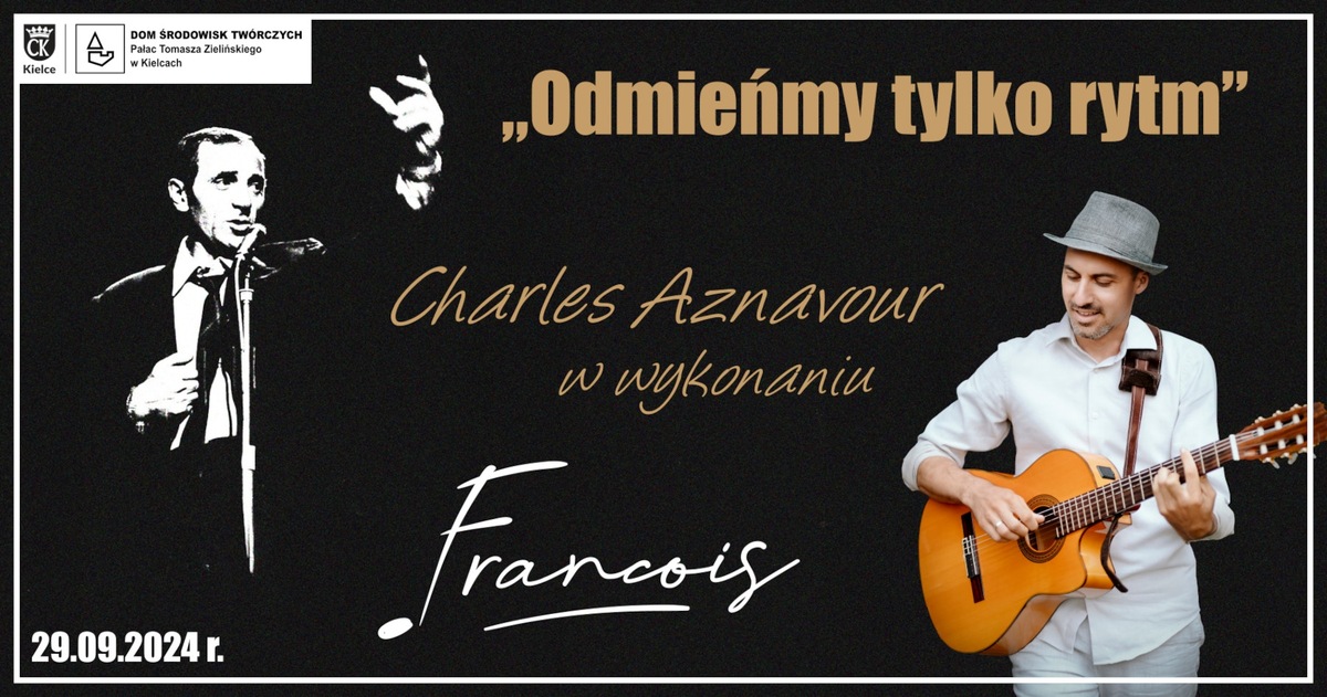 Charles Aznavour jest uznawany za jednego z najwybitniejszych francuskich piosenkarzy. W tym roku obchodziłby setne urodziny… Francois stworzył spektakl „Odmieńmy tylko rytm”, w którym jego piosenki, śpiewane po francusku i polsku, przeplatają się z najciekawszymi anegdotami i cytatami zaczerpniętymi z życia artysty. Francois jest zawodowym francuskim piosenkarzem zakochanym w Polsce od 2011 r. Karierę sceniczną rozwinął po zdobyciu w 2018. roku „złotego przycisku” w polskiej edycji programu telewizyjnego “Mam Talent”. Od tej pory często i regularnie koncertuje z programem polsko-francuskim na terenie całej Polski. Bywa także gościem stacji telewizyjnych i radiowych. Jest Laureatem XV Konkursu im. Jonasza Kofty „Moja wolności” za francuską wersję...