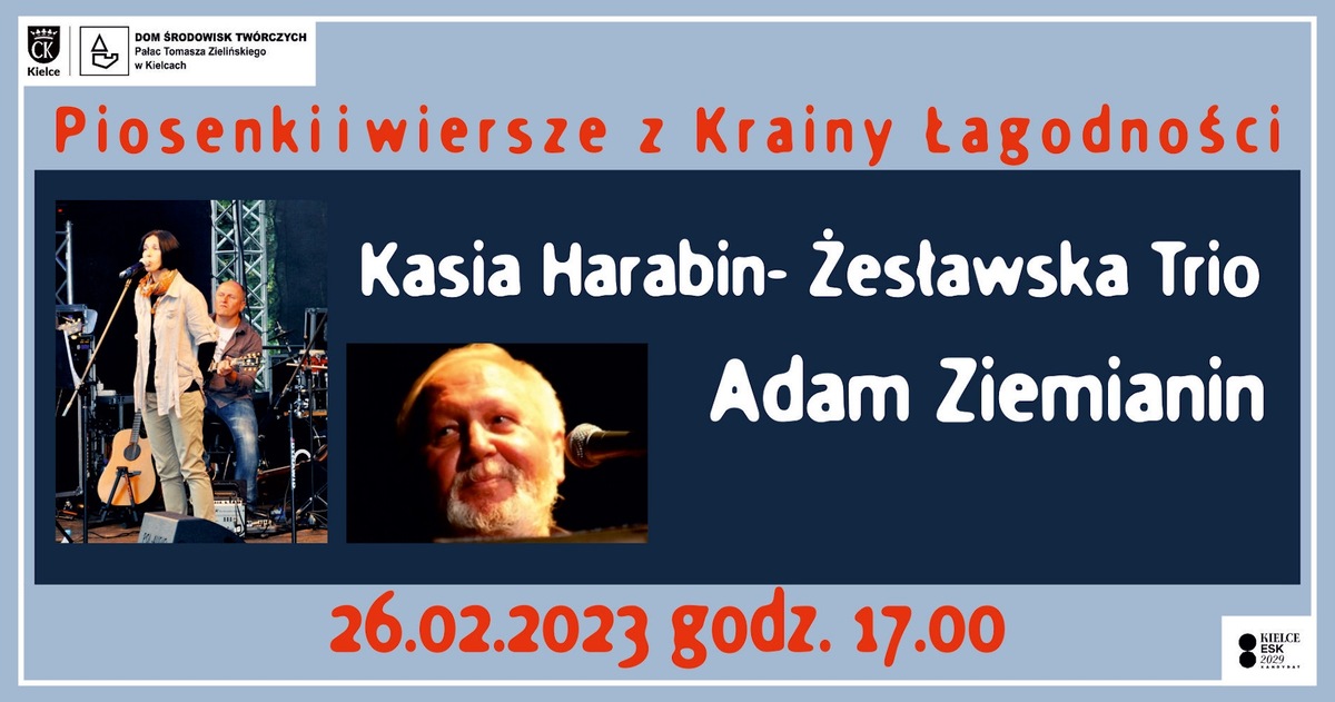 Zapraszamy na koncert pt. "Piosenki i wiersze z krainy łagodności", podczas którego Trio Kasi Harabin-Żesławskiej będzie śpiewać, a poeta Adam Ziemianin będzie czytał swoje piękne wiersze. Kasia Harabin-Żesławska Trio Kasia Harabin-Żesławska - wokalistka wywodząca się z nurtu poezji śpiewanej. Muzyczną przygodę rozpoczęła w harcerskim zespole Wołosatki z Kielc, z którym koncertowała w całej Polsce, wielu krajach Europy i na Kubie. Jako solistka otrzymała nagrody i wyróżnienia na wielu festiwalach m. in. na Festiwalu Piosenki Studenckiej w Krakowie, Śpiewajmy Poezję w Olsztynie. Można ją usłyszeć na płytach Andrzeja Poniedzielskiego, zespołu TAX FREE (finalisty Must be the Music). Współpracuje również z legendarną Wolną Grupą Bukowina. Występuje...