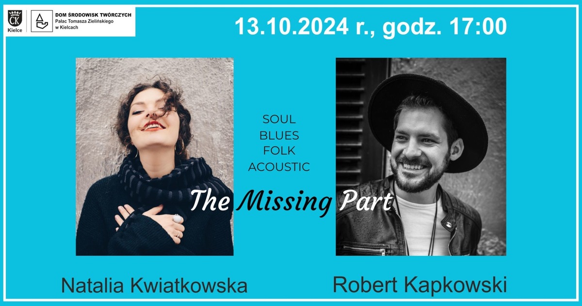 The Missing Part to duet stworzony przez Natalię Kwiatkowską i Roberta Kapkowskiego (CHEAP TOBACCO) z tęsknoty za lirycznymi i subtelnymi dźwiękami. Natalia bawi się głosem i swobodnie porusza się w każdym gatunku, przenosi słuchaczy w inny świat. Robert, gra na gitarze akustycznej w taki sposób, że słuchacze często odnoszą wrażenie jakby grał cały zespół. Usłyszycie ich autorskie piosenki z debiutanckiej płyty ale także własne aranżacje m.in Henryka Warsa, Bronisława Kapera, Ewy Demarczyk, Etty James, Arethy Franklin i innych. Natalia i Robert za swoją twórczość otrzymali ponad 30 nagród i wyróżnień. Ich kompozycje trafiły na listy przebojów radiowej Trójki, Antyradia oraz wielu lokalnych rozgłośni radiowych. Stworzyli wspólnie ponad 60 piosenek,...