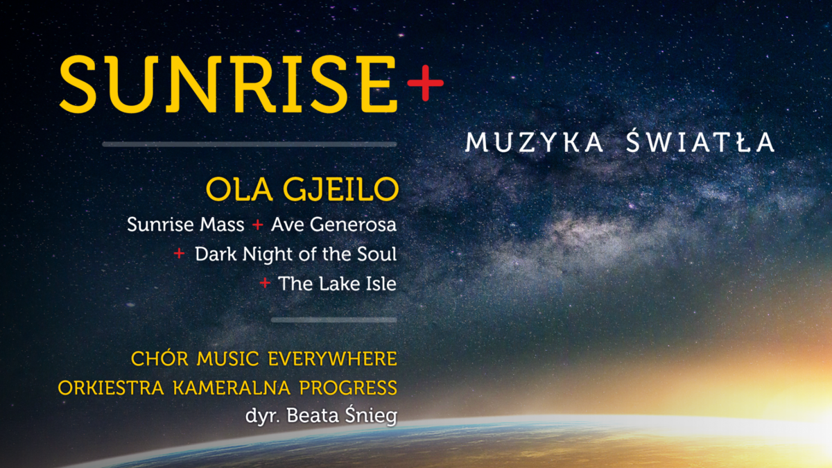 To wydarzenie, podczas którego usłyszysz muzykę kosmosu, żywiołów i sfer… Dźwięki Ola Gjeilo, jednego z najbardziej utalentowanych współczesnych kompozytorów, poruszą do głębi Twoje serce i duszę. Jego genialne kompozycje: „Sunrise Mass”, „Ave Generosa”, „The Dark Night of the Soul”, czy „The Lake Isle” przeniosą Cię w nieznane miejsca i czasy, malując nowe krainy. To głęboka, emocjonalna i intymna muzyka, która uspokoi Twoje myśli i przyniesie wytchnienie. Ponad pięćdziesięciu chórzystów Music Everywhere – pasjonatów nowatorskich brzmień, muzyki współczesnej oraz filmowej; Orkiestra Kameralna Progress – wirtuozi klasyki, jak i nowoczesnych form; wizualizacje, światła... To wszystko, byś mógł przeżyć niezapomniane spotkanie z czystym pięknem....