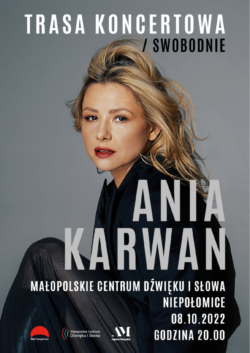 Zapraszamy na koncert Ani KARWAN / Trasa koncertowa SWOBODNIE. Obecnie Ania jest w trakcie pracy nad swoim drugim albumem, który ukaże się już tej jesieni. Natomiast trasa koncertowa to przedsmak tego co usłyszeć będzie można na płycie. Podczas koncertów publiczność usłyszeć będzie mogła piosenki z nowej płyty, ale i Jej dobrze znane hity w zupełnie nowych aranżacjach. Początkiem tego roku ukazały się dwa single promujące drugie wydawnictwo Ani - "Swobodnie" oraz piosenka o przewrotnym tytule "Papierosy". Kolejne niebawem... Z A P R A S Z A M Y! 8 października, sobota, godz. 20:00 Sala Widowiskowa MCDiS Niepołomice, ul. Zamkowa 4, wejście A*******