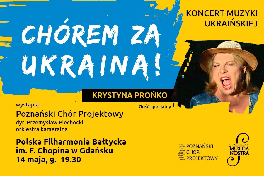Gdańsk, Polska Filharmonia Bałtycka im. F. Chopina w Gdańsku, 14 maja, godz. 19.30 Chórem za Ukrainą to szczególny koncert muzyki ukraińskiej. Wystąpi dla Ciebie 60-osobowy profesjonalny Poznański Chór Projektowy, orkiestra kameralna, a przede wszystkim powszechnie znana i lubiana legenda polskiej estrady Krystyna Prońko. Ten imponujący aparat wykonawczy zapewni Ci wieczór pełen niezapomnianych emocji. W trakcie koncertu zabrzmią oryginalne ukraińskie utwory ludowe w aranżacji uznanego poznańskiego kompozytora Mariusza Matuszewskiego. Niebywałych wrażeń akustycznych dostarczy Ci światowej klasy nagłośnienie w technologii High End firmy Danley. Koncert poprowadzi i zadyryguje Przemysław Piechocki....